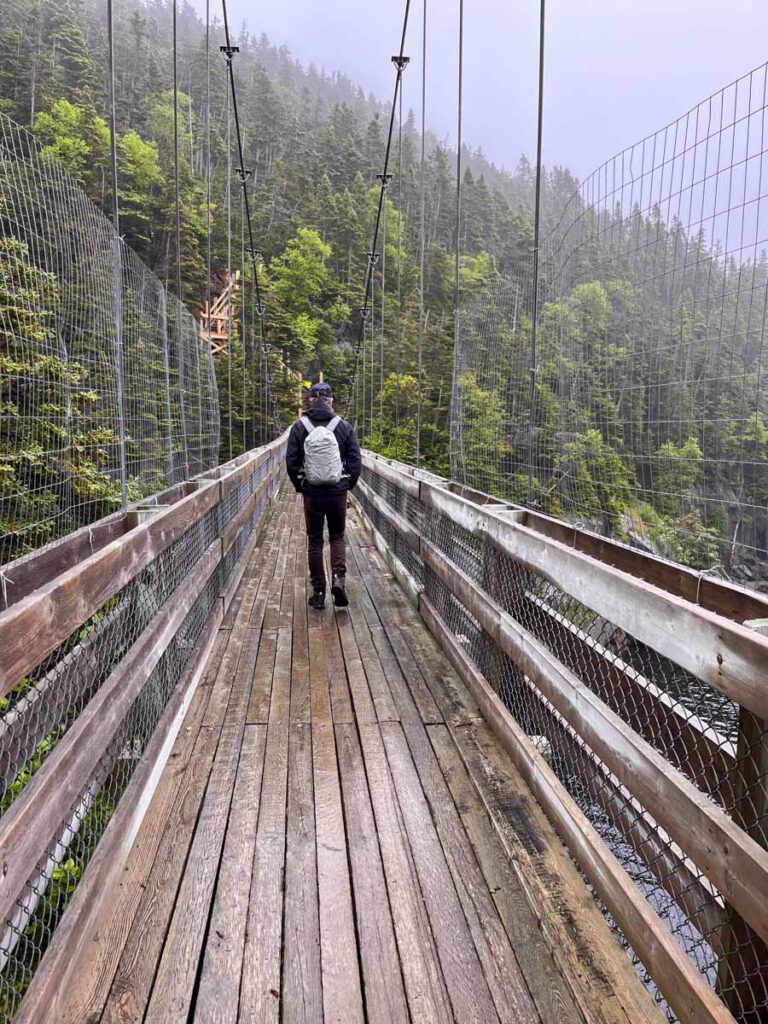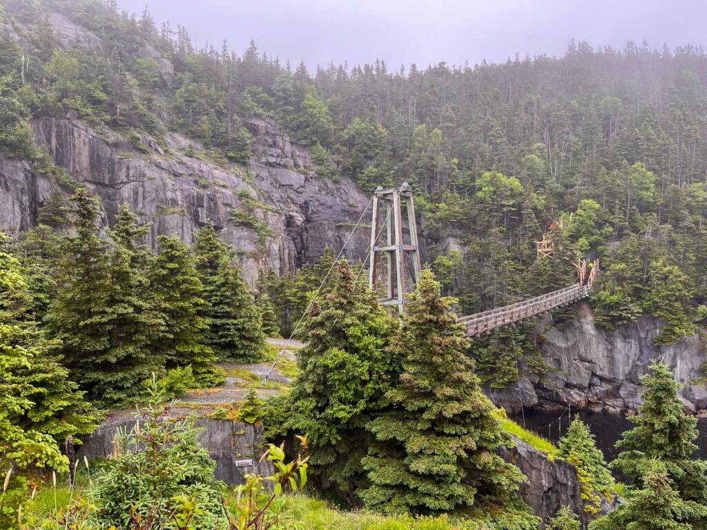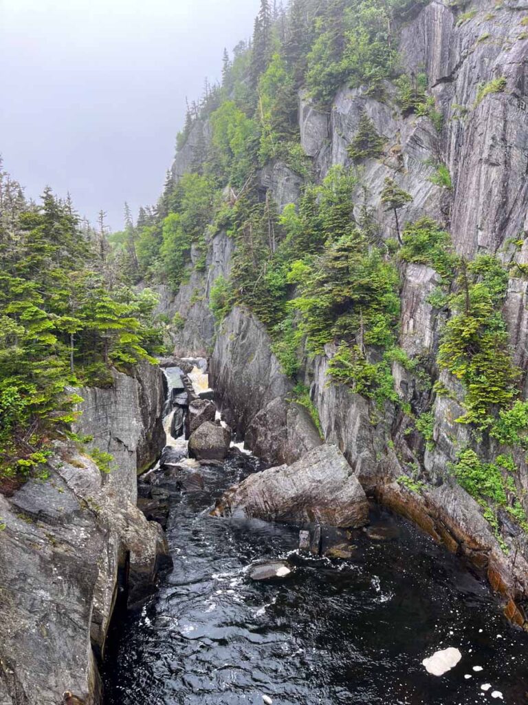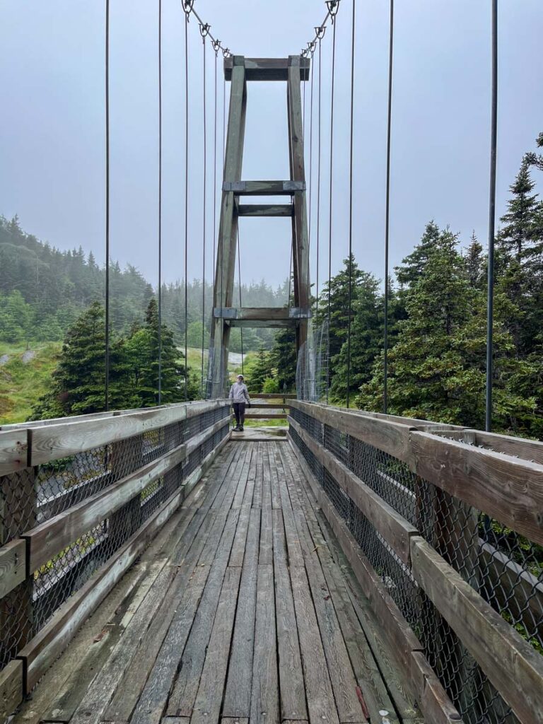 Premier arrêt, le pont suspendu de La Manche. Note importante, le pont se prend par deux endroits différents. Le premier côté, du parc Provincial La Manche. Attention, pour l’instant, il n’est pas accessible, ils réparent les centaines de marches. Mais par Brigus, tu te rends directement au village. C’est encore une autre section de la East Coast Trail, La Manche section. Il y a un chemin de terre “praticable” pour environ 4 km, et nous y sommes. Ce petit village est abandonné depuis 1966, à la suite d’une bonne tempête de neige. Il y avait une école qui comptait que 11 élèves, mais bon.