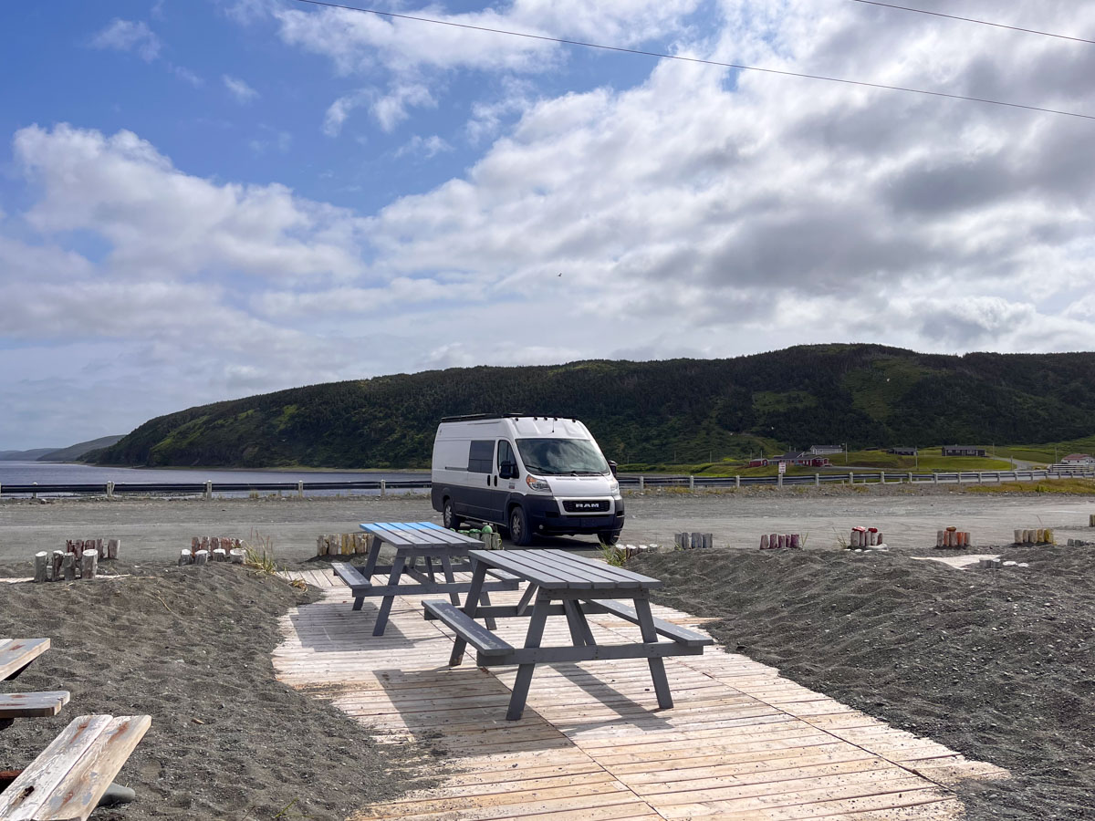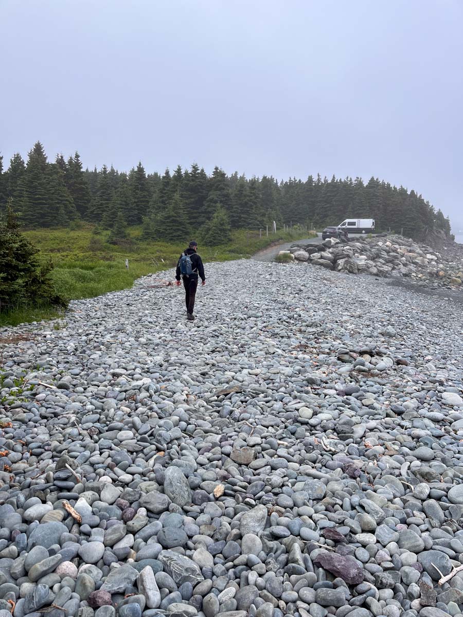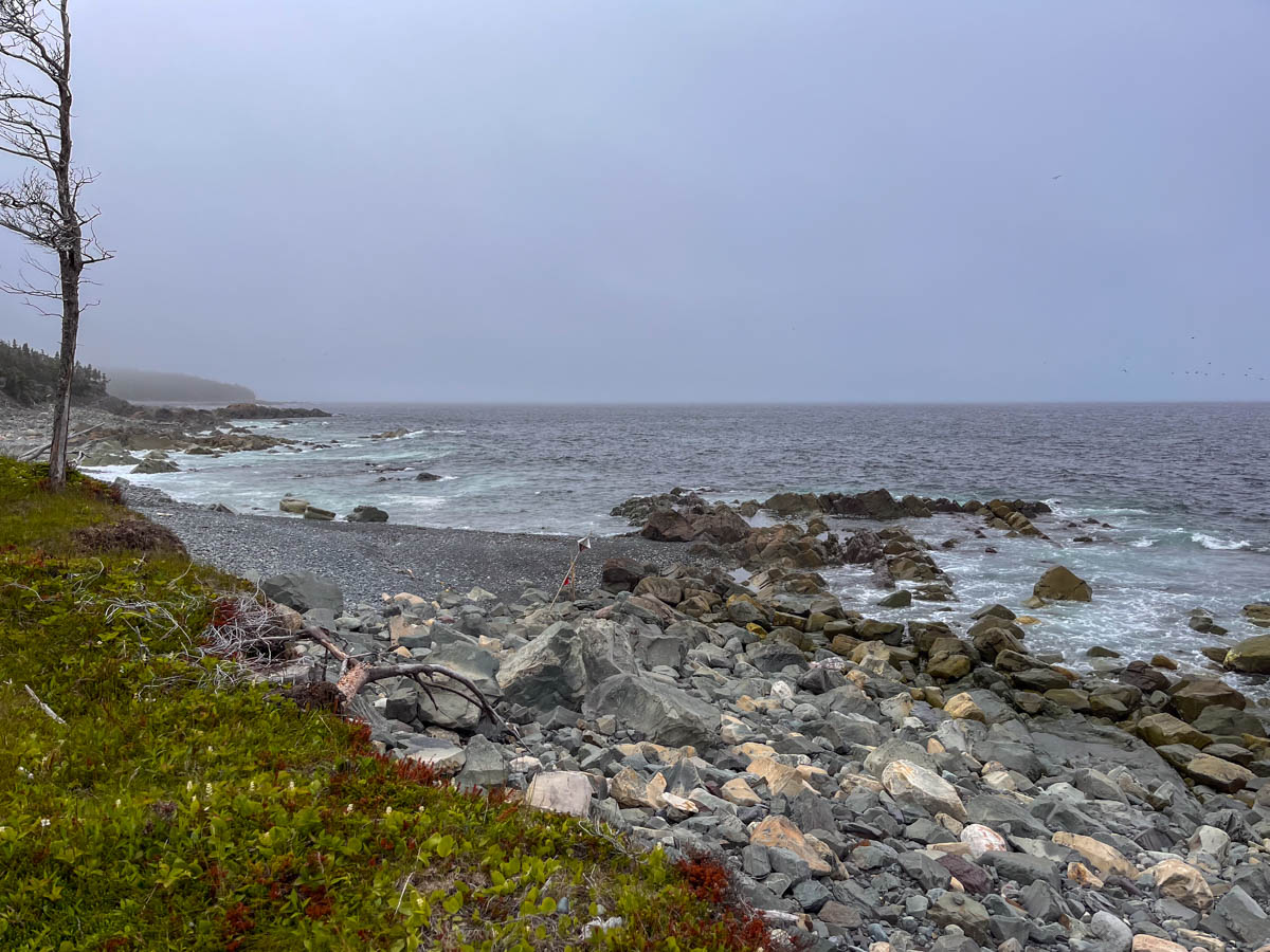 Le brouillard décide d’arriver en descendant à Branch. Mais il est très épais ce brouillard. On ne voulait pas aller à Ste-Mary’s ecological réserve, ben on veut encore moins. On regarde les endroits sur le bord de le mer, qui n’a pas de brume, et qui est le plus près possible de Placentia. On voit un spot, fantastique à Gooseberry. On descend à pied, pour voir l’état de la route, et c’est ici qu’on se pose, pour une dernière fois. C’est le paradis. Nous sommes seuls. Un peu plus tard, un autre véhicule de la Nouvelle Écosse est venu se poser. Il bloquait le chemin, ça n’a pas été long qu’il s’est fait avertir. Des locaux viennent marcher sur la plage, des enfants viennent jouer et se baigner. C’est très zen comme endroit, et comme à l’habitue, les gens sont respectueux. Honnêtement, c’est ici que j’aurais ma maison, si…