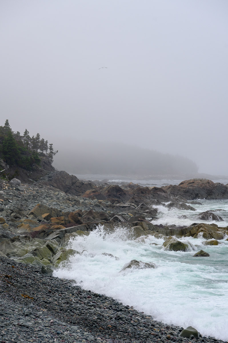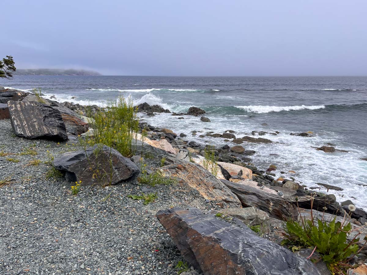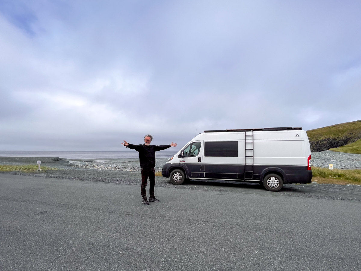 Le brouillard décide d’arriver en descendant à Branch. Mais il est très épais ce brouillard. On ne voulait pas aller à Ste-Mary’s ecological réserve, ben on veut encore moins. On regarde les endroits sur le bord de le mer, qui n’a pas de brume, et qui est le plus près possible de Placentia. On voit un spot, fantastique à Gooseberry. On descend à pied, pour voir l’état de la route, et c’est ici qu’on se pose, pour une dernière fois. C’est le paradis. Nous sommes seuls. Un peu plus tard, un autre véhicule de la Nouvelle Écosse est venu se poser. Il bloquait le chemin, ça n’a pas été long qu’il s’est fait avertir. Des locaux viennent marcher sur la plage, des enfants viennent jouer et se baigner. C’est très zen comme endroit, et comme à l’habitue, les gens sont respectueux. Honnêtement, c’est ici que j’aurais ma maison, si…