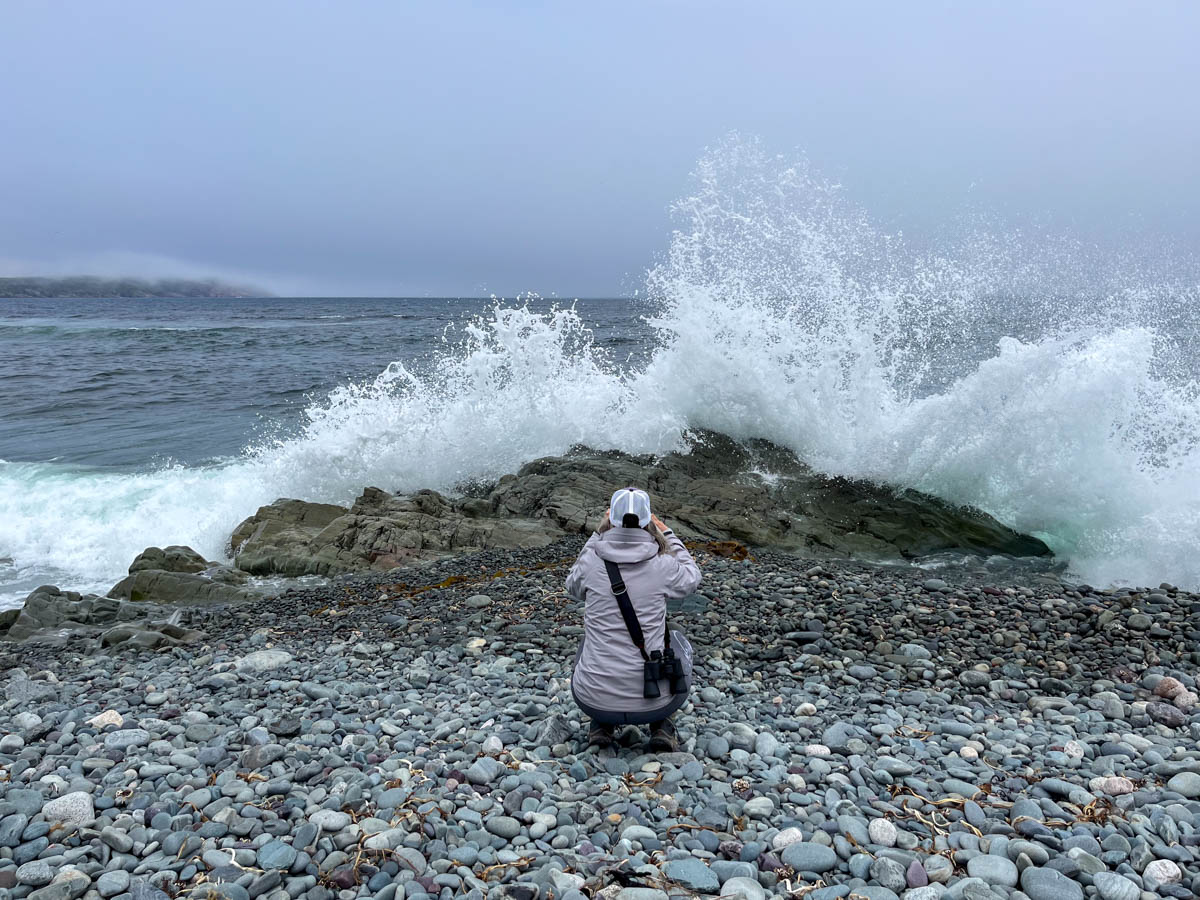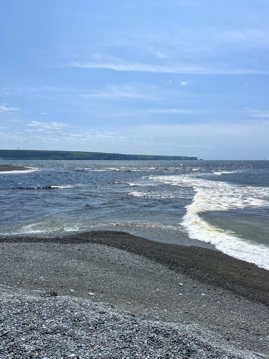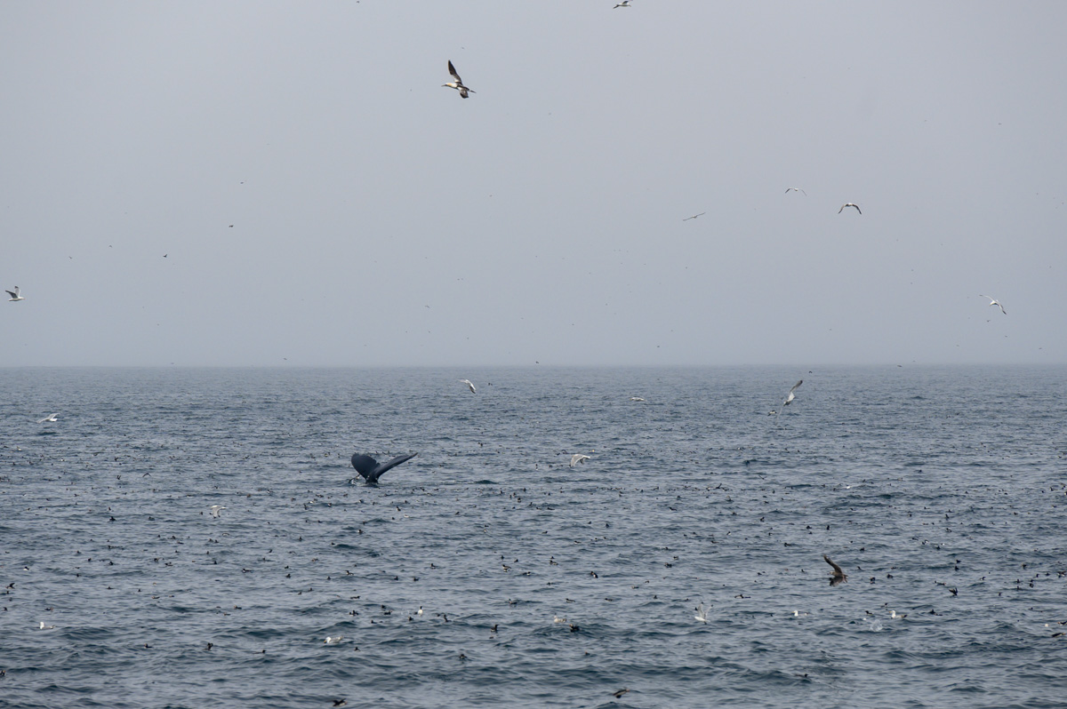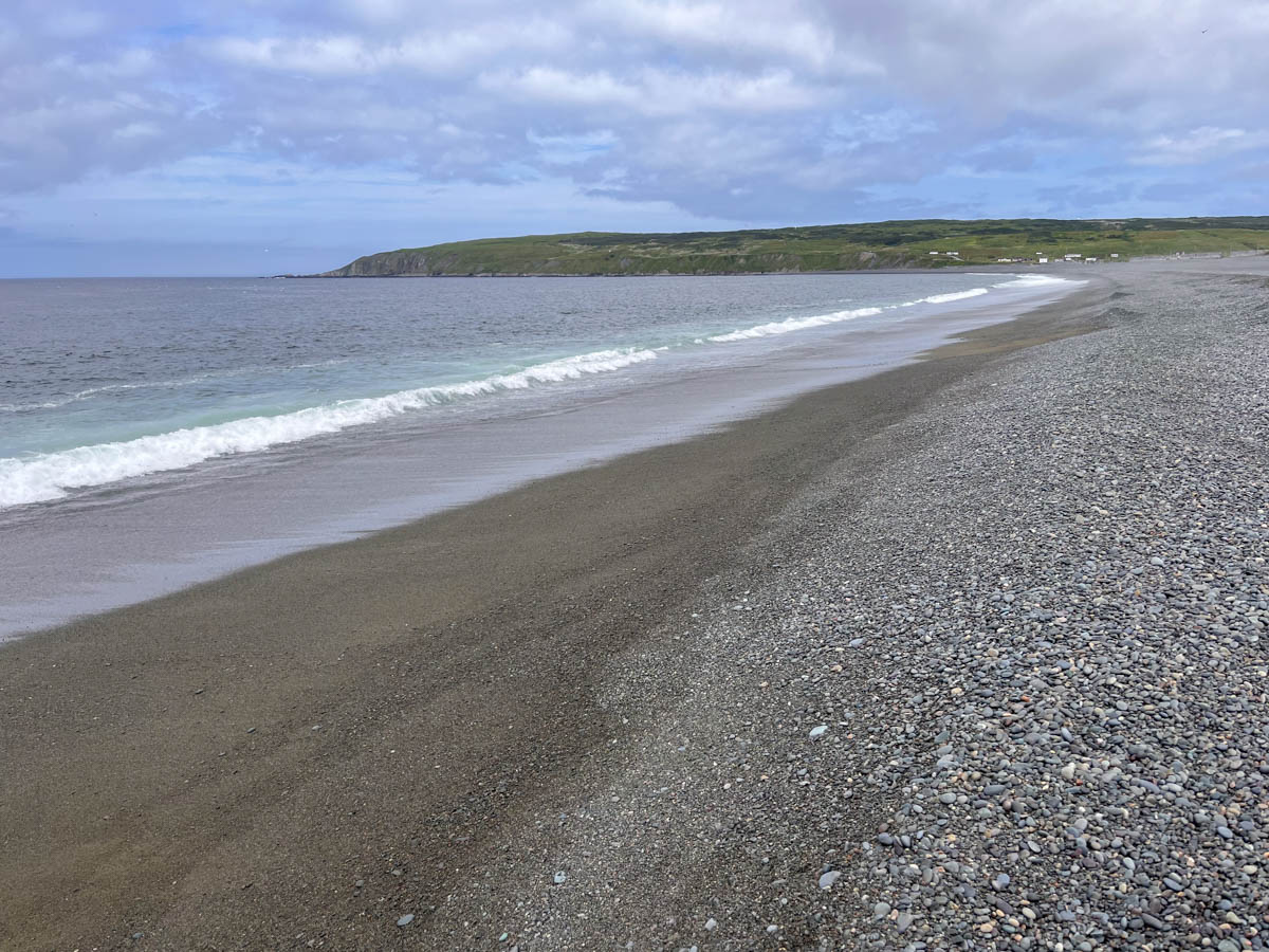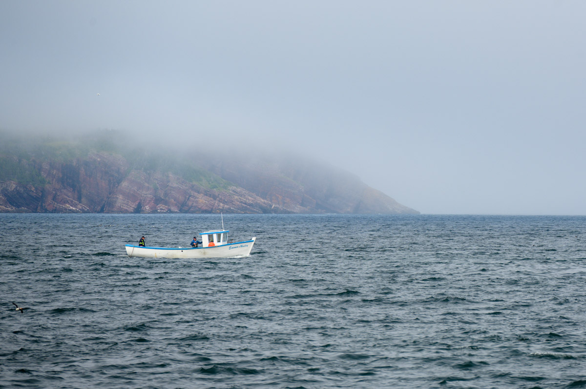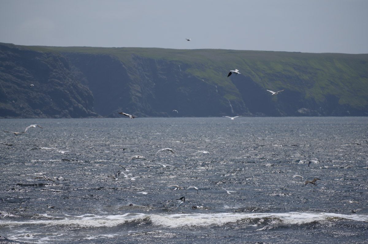 On voit quelques baleines au loin. Et plus on avance vers la pointe sud, plus il y a de la vie. Le summum nous attend à quelques minutes de marche. Tout ce qu’on devrait voir, y est. Et en très grande quantité. Des milliers d’oiseaux, des baleines qui savourent le capelan, tout dans une seule vue, en avant de nous. Tout ce qui manque, c’est des orignaux, des caribous et un iceberg, et on aurait tout vu en un seul endroit. Il paraît qu’il y a des icebergs de temps en temps, mais pas cette fois.
