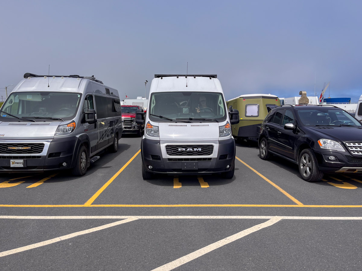 Nous sommes les premiers. Nous n’avons rien d’autre à faire, tout aussi bien aller se télécharger des émissions avec leur Wifi. Première étape, enregistrement et prise de mesure. La van mesure maintenant 22 pieds… Si vous allez lire les spécifications d’un Promaster allongé, c’est 20.8 pieds… Je n’ai pas de “rack” à l’arrière… Hmmm. Il y aura des frais supplémentaires. Je lui dit c’est impossible. Elle reprend la mesure, cette fois, 22.8 pieds. Et on m’invite, poliment, avec une certaine pression, de prendre la mesure moi-même. Ça sert à rien. En 8 semaines j’ai eu 2 mauvaises expériences. Le camionneur du début et le service d’enregistrement. Ça vient de me couter 115 dollars. Elle me dit finalement, que 20.8 pieds, c’est 21, et que 21, 22 ou 23 pieds c’est le même prix. Alors la longueur n’a pas d’importance. Je n’ai pas un 20 pieds… point…