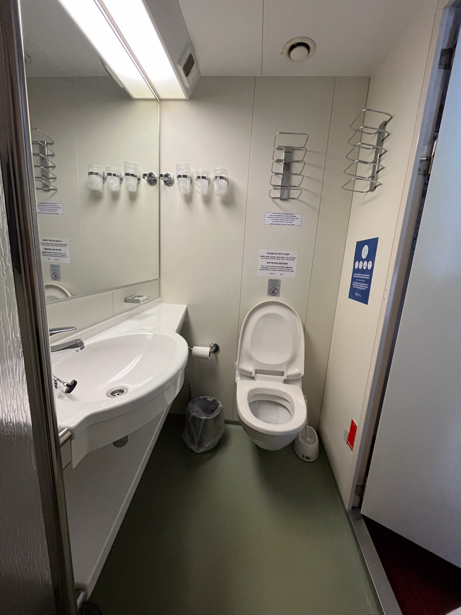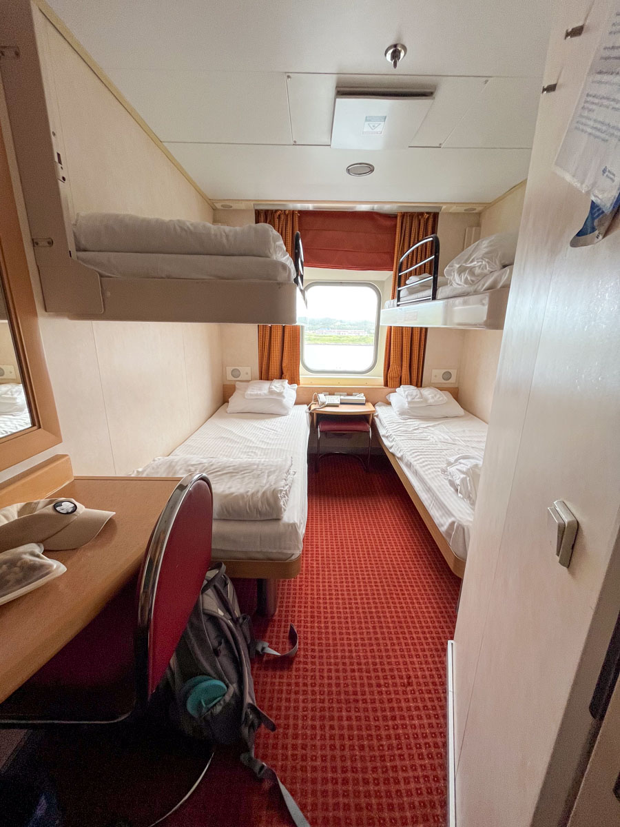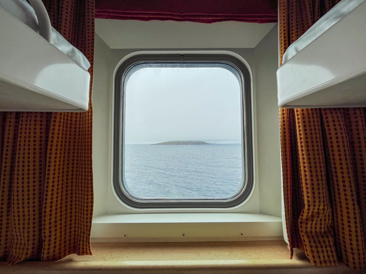 Les dieux sont avec nous, le brouillard arrive, et la corne de brume du bateau se fait aller. On parcoure le bateau, et on remarque qu’il y a beaucoup de chambres, et que le salon est différent du premier traversier. Ce n’est pas une multitude de bancs en rangée, mais plus comme un lounge. Ça se pitche littéralement pour avoir une place. On comprendra plus tard que la majorité de ces personnes n’ont pas de chambres, et ils veulent une place pour dormir cette nuit.