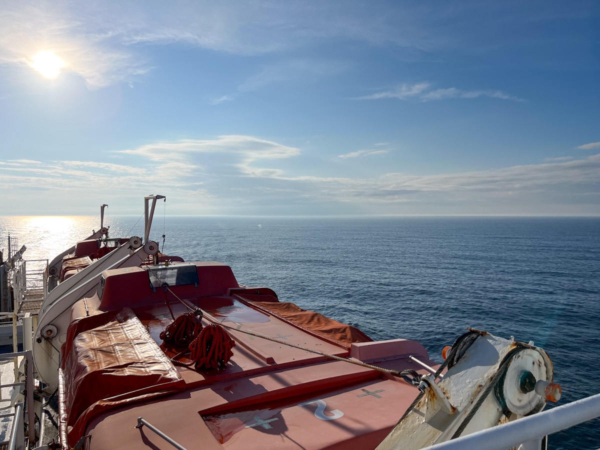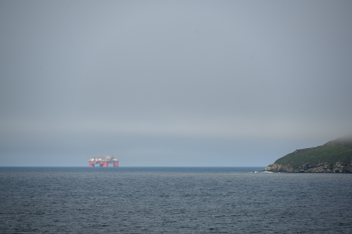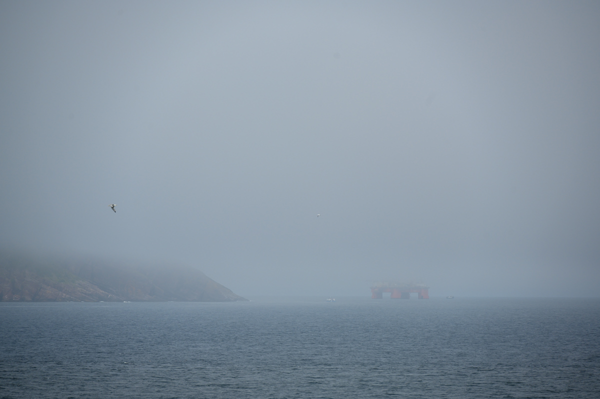 Première belle surprise, une plateforme de forage fait son apparition. Elle est loin, dans le brouillard, mais c’est tellement gros qu’on peut facilement la distinguer. En plus, le brouillard se dissipe. En quelques minutes, tout est clair. Nuageux, mais clair.