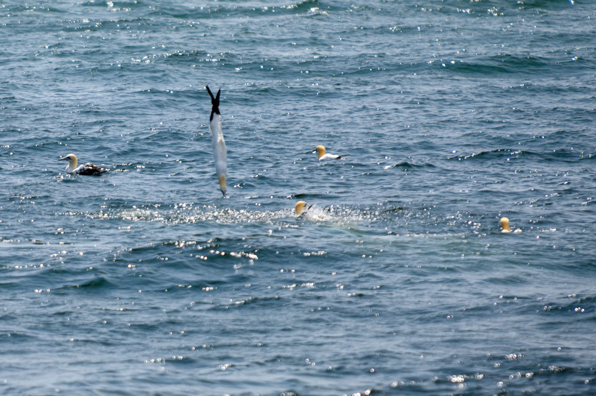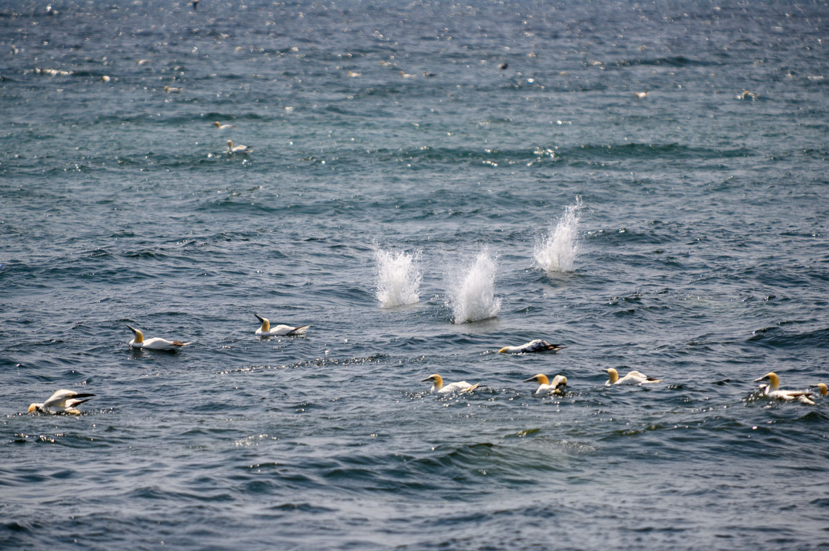Il y a des centaines de fous de Bassan qui plongent sans cesse. Il y a du capelan. Il ne roule plus, mais on sait qu’il roulait ici, ça sent fort sur la plage, et on voit des restes de capelan de temps à autres. Mais aucune baleine. Les baleines viennent se nourrir de capelan, et elles remontent vers le nord. On en a vu plusieurs il y a quelques jours, il faut croire qu’ici c’est terminé. Finalement, dans tout la journée, Louise aura vu une baleine à bosses au loin, à frapper de la queue, et tout près, deux rorquals.