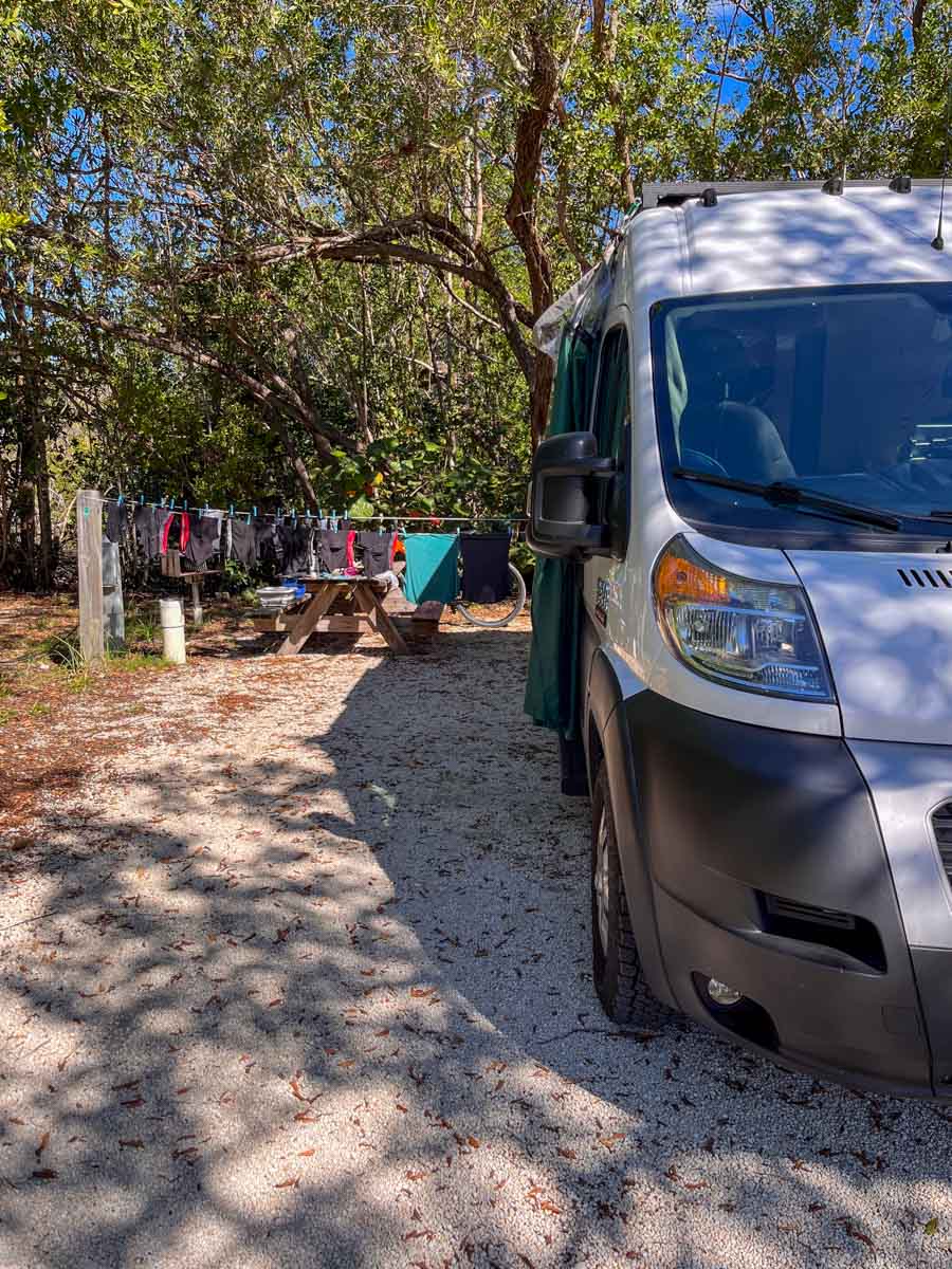 On repart pour le parc. Je m’attendais réellement à être sur le bord de la plage. On a lu certains commentaires, et la plongée en apnée, autant que la plongée bouteille, semblaient magnifiques. Première constatation, contrairement aux autres “campings” que nous avons fait, on est assez cordés, mais c’est quand même beau. Juste en arrière de nous il y a un chemin où les alligators peuvent entrer et sortir. J’espère que nous n’aurons pas de surprises.