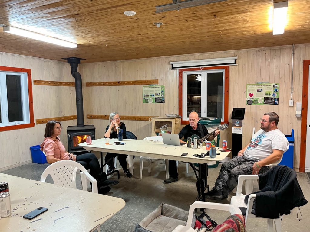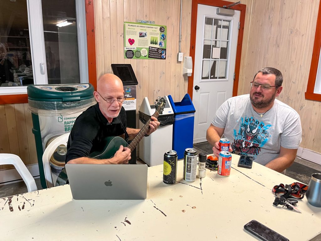 Alain a un nouveau logiciel et il peut suivre les paroles et les accords live. Et il trouve plein de chansons. C’est tellement le fun d’avoir un chansonnier à nous, autour d’un feu ou pas. Les gens quittent peu à peu.