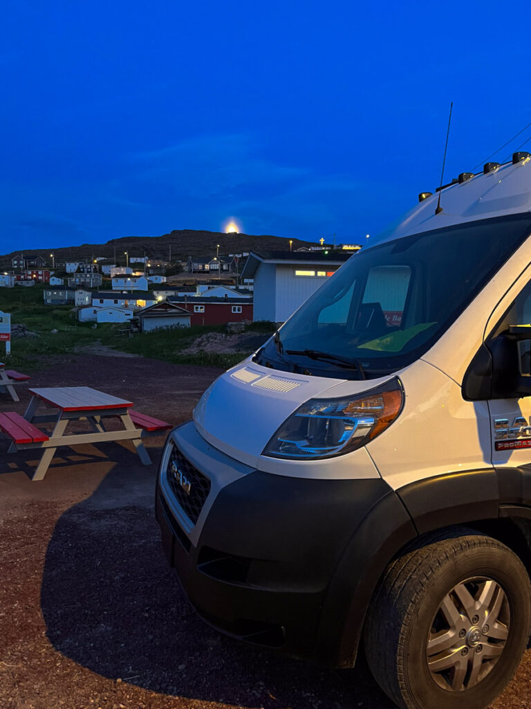 On arrive à Pouch Cove. C’est mignon. On monte la première côte de la rue qui mène au phare du Cap St-Francis. Le GPS me donne une information bizarre. 6km à faire, 12 minutes. Ça ne se peut pas. Cette première côte, elle est côte, comme on dit. On arrive alors sur un chemin de gravel. Le style de chemin que tu ne veux pas prendre en van. Mais on a appris, à Terre-Neuve, qu’au moment de se décourager, quelque chose de beau arrive, donc on poursuit. On monte des côtes, on en descend des maudites (je stresse pour la remontée). Des trous, partout, les bananes dans le filet à fruits se fracassent contre le cadre de la fenêtre. Pas mieux.