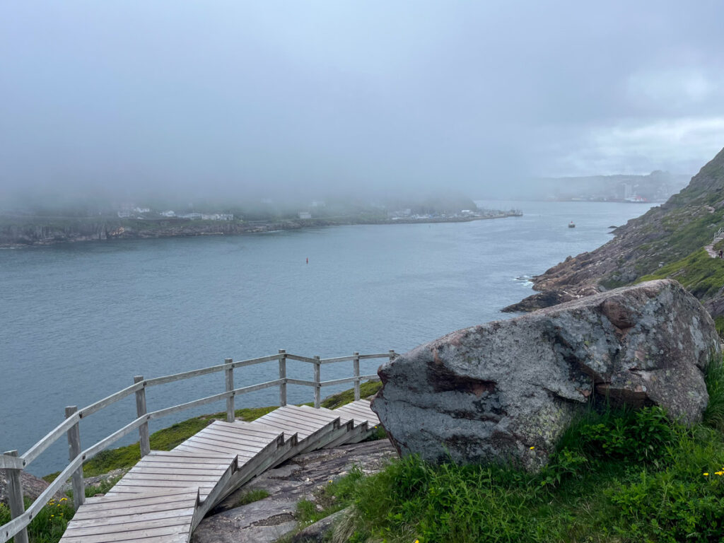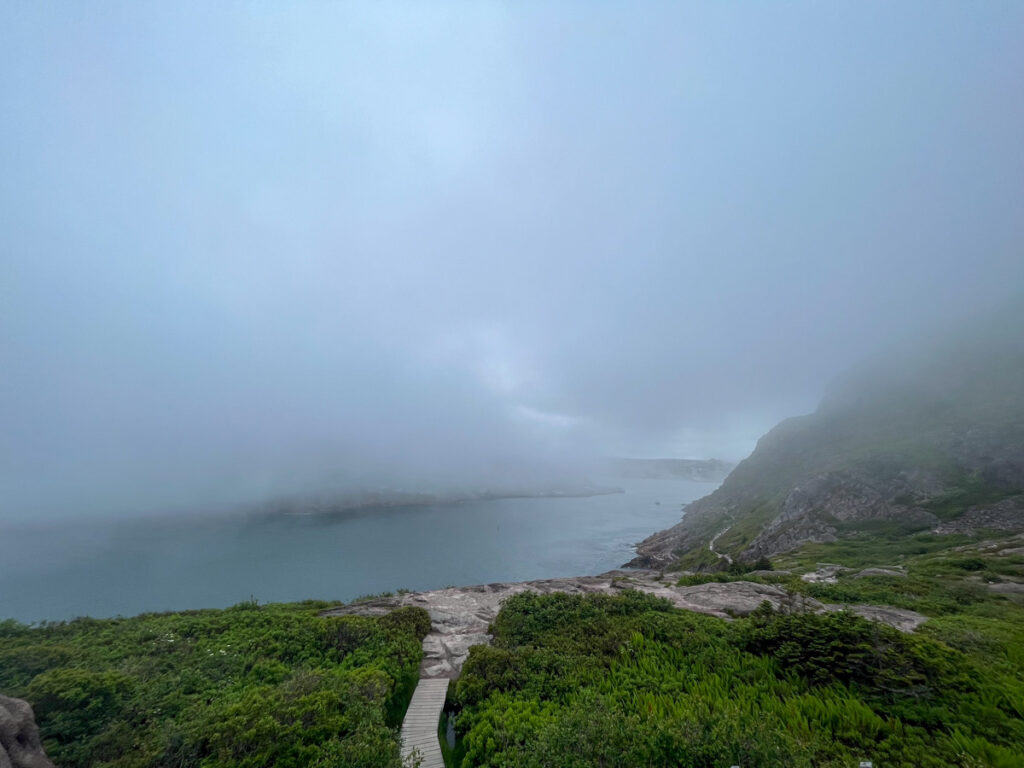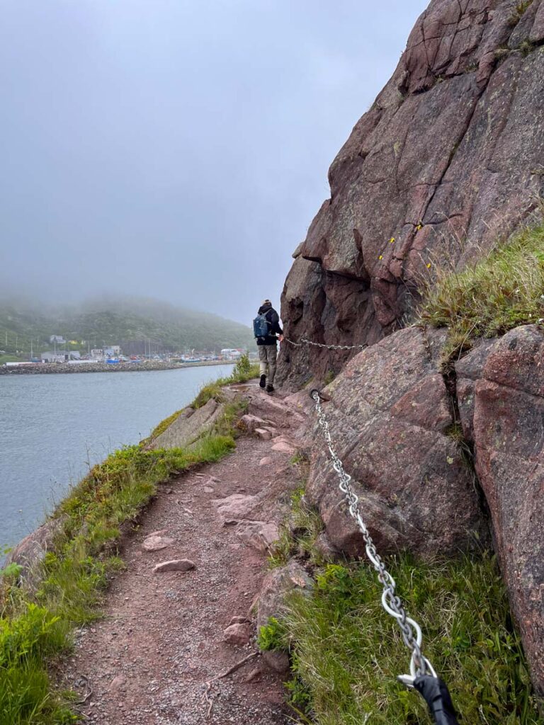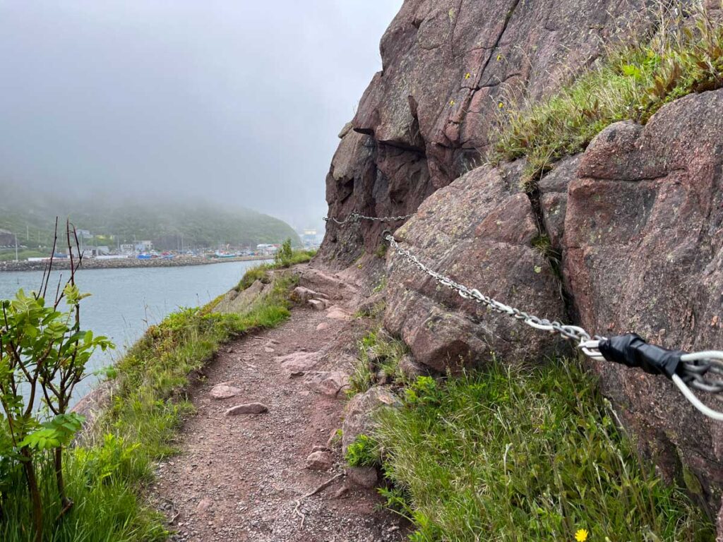 C’est un beau sentier, quand tu peux voir quelque chose. Lorsque le brouillard se dissipe un peu, pour quelques secondes, on a de belles vues. On voit les anciens bunkers, et on termine la première partie de la rando (après un falaise où il y a des chaînes pour s’y tenir) dans la ville. C’est tout simplement beau. On aime voir les petites, parfois grandes, maisons typique colorées. La rue se nomme Battery Road. NE PAS Y ALLER EN VAN car la rue est très très étroite et la pente très raide.