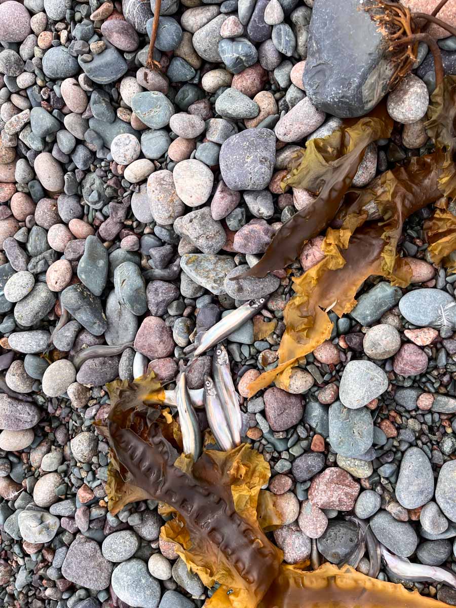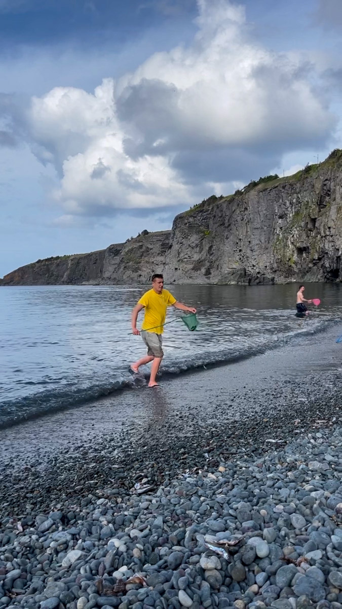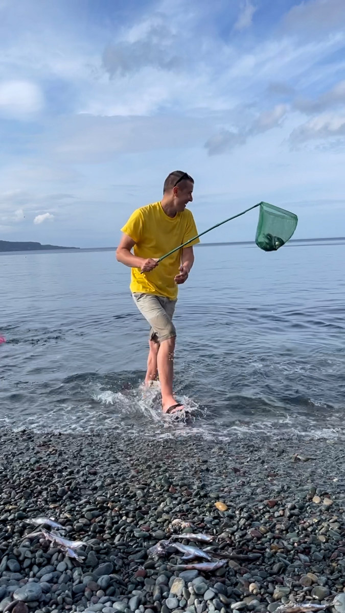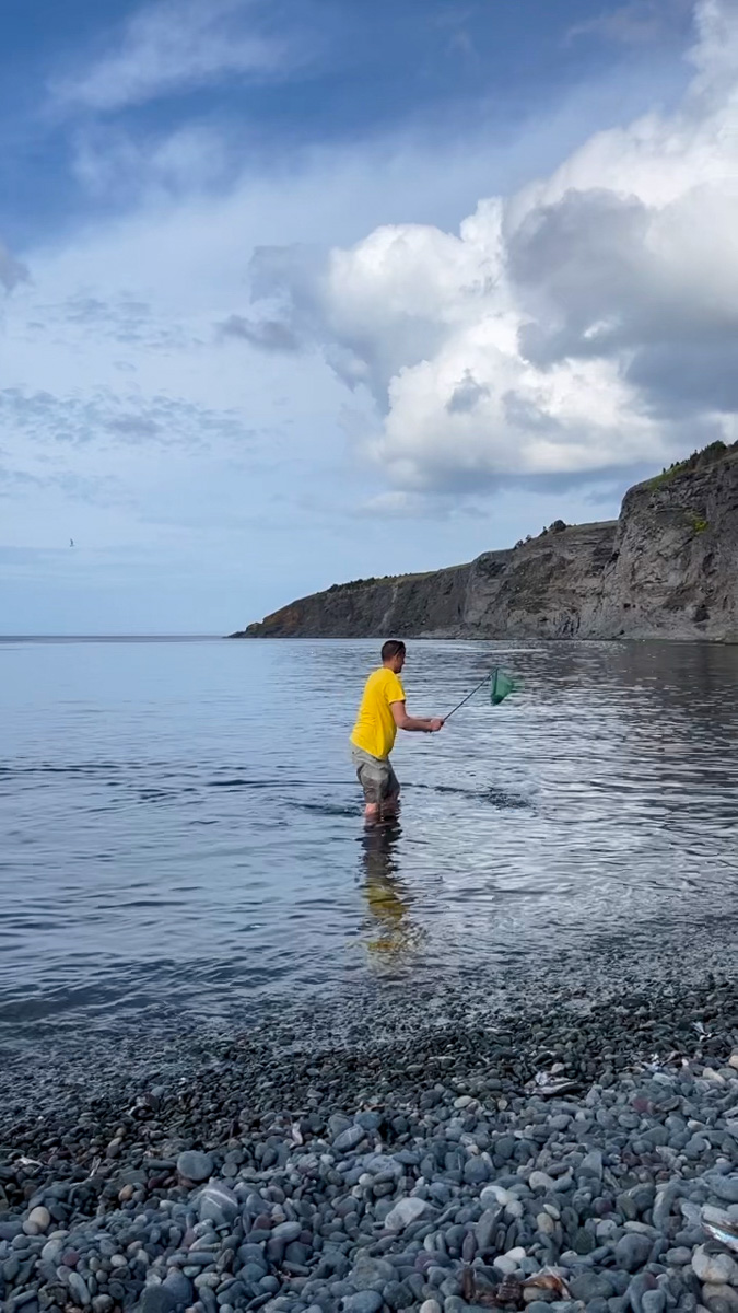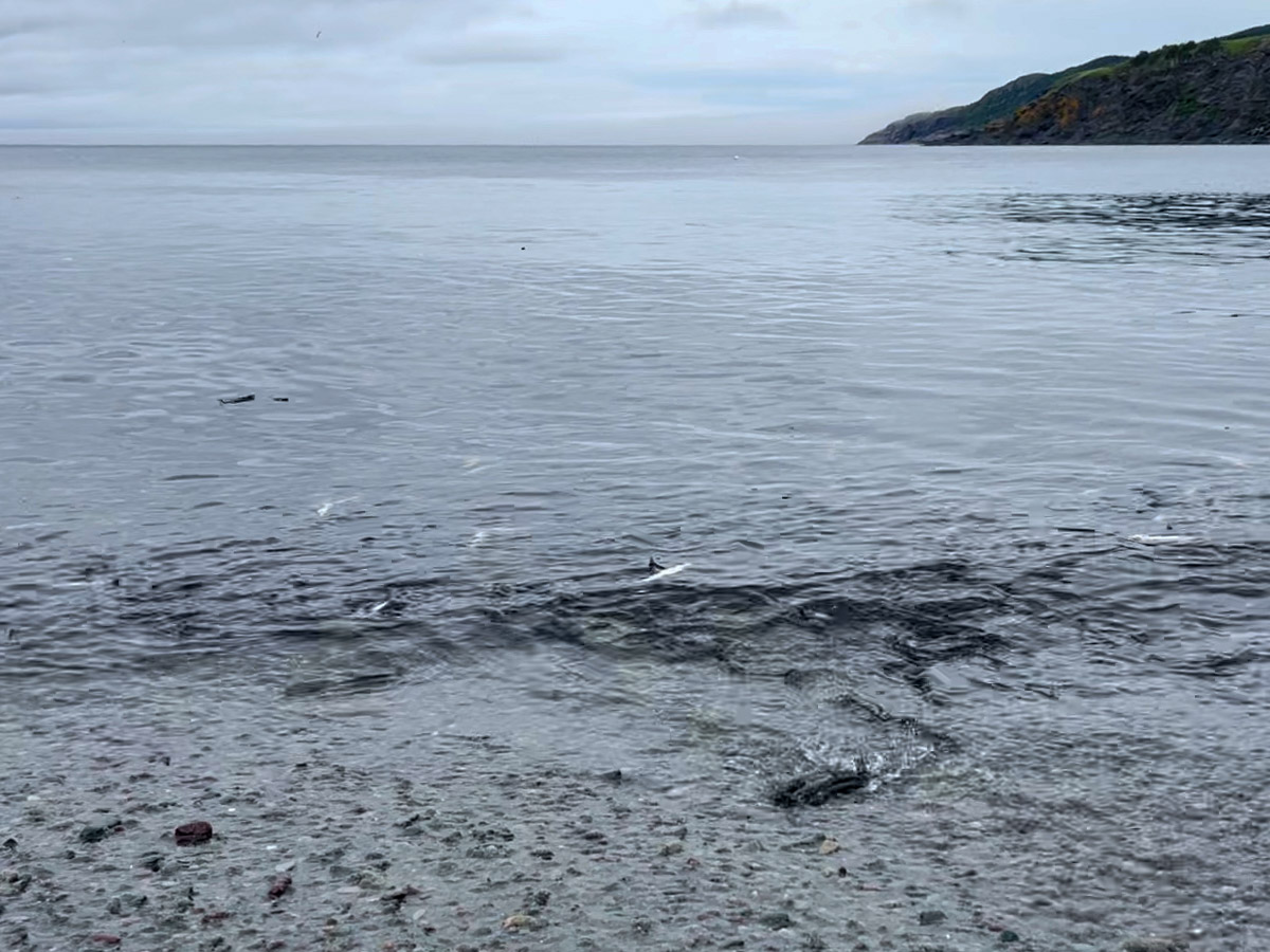 En arrivant à Middle Cove, il y a déjà des “visiteurs” mais moins qu’hier. Mais ça ne tardera pas car le mot circule, il y a du caplan qui roule sur la plage. Il y a plus de caplan qu’hier. Les visiteurs arrivent de partout. Ils en pêchent pour manger (asiatiques, indiens et terre-neuviens) et pour fertiliser leurs jardins (les Terre-Neuviens). Certains on des puisettes/filets, comme hier, mais d’autres ont de solides filets de pêche qu’ils lancent à l’eau. En un coup, ils remplissent une grosse chaudière Rona/Home Depot.