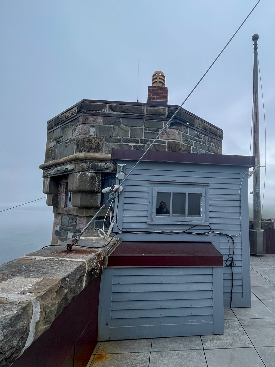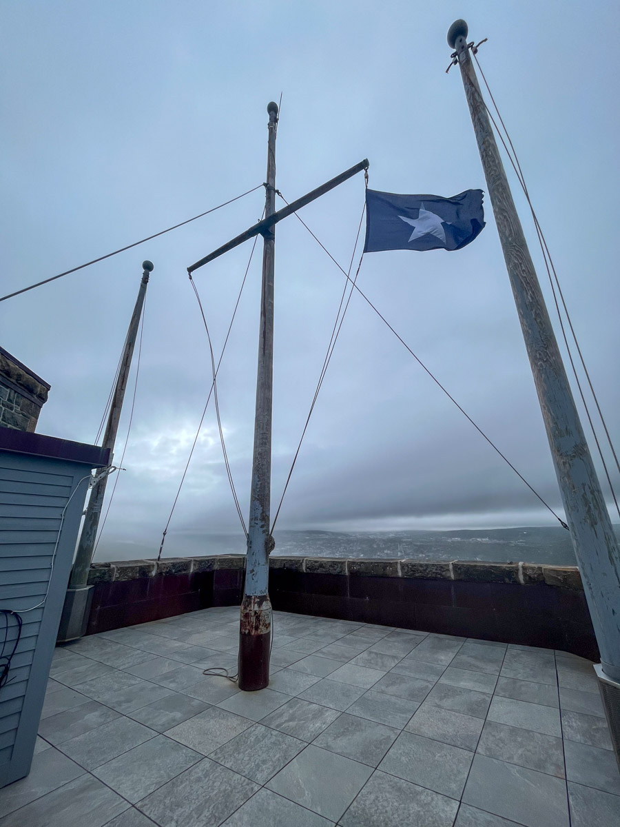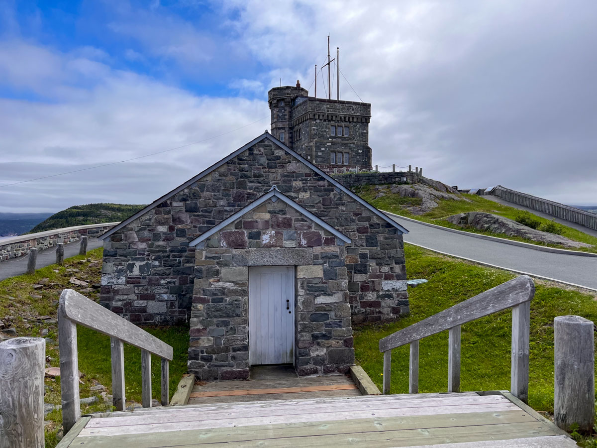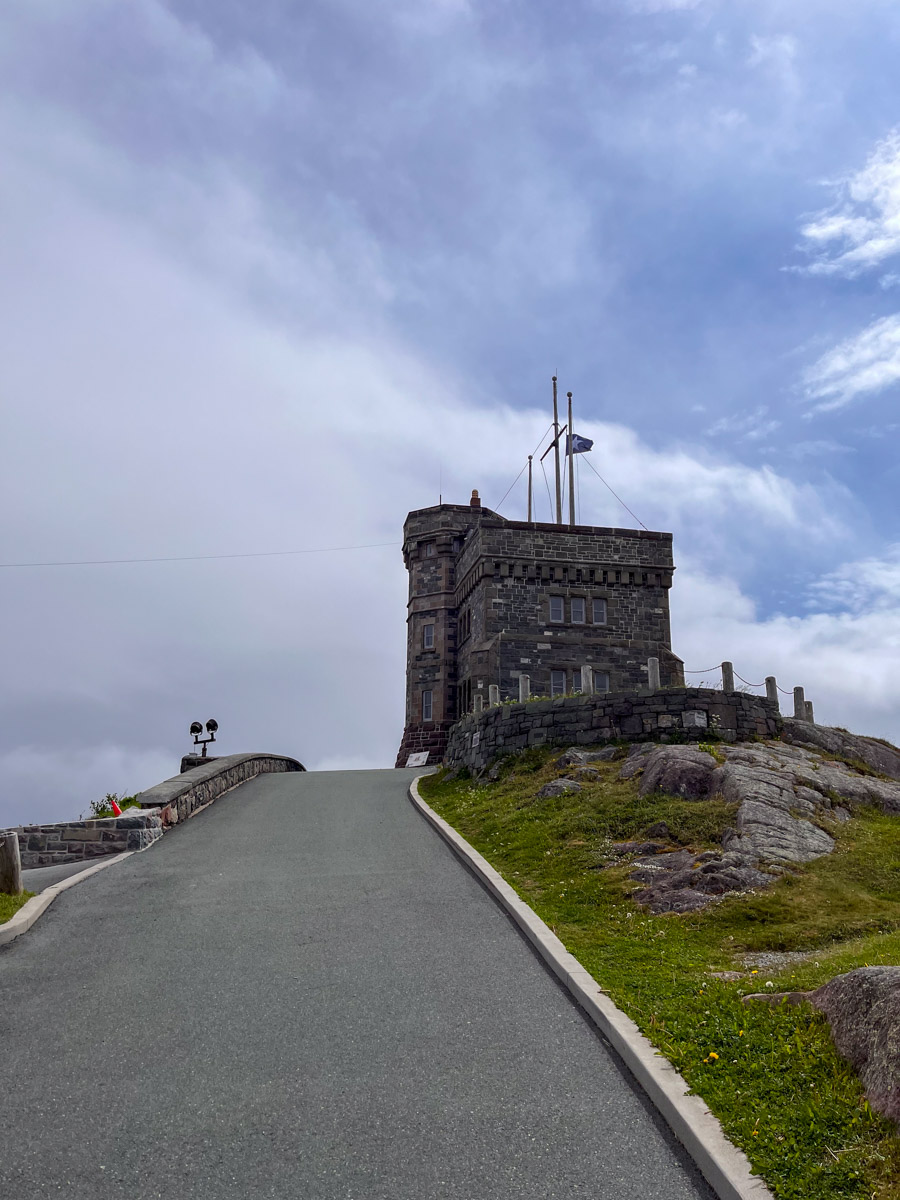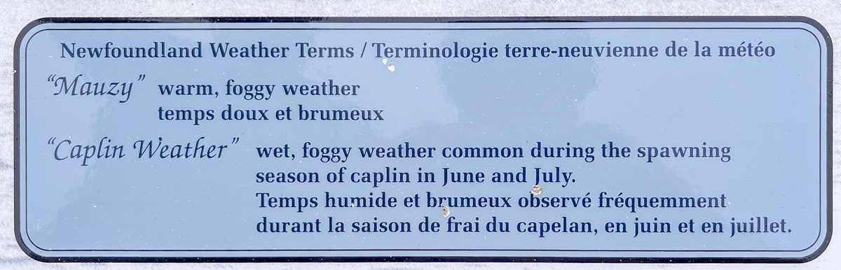 Une fois la visite faite du centre d’interprétation, on va visiter la tour Cabot. On ne voit rien. Ce n’est plus un temps RDF, c’est maintenant un Caplin Weather. C’est quoi un Caplin Weather? C’est un temps RDF lors de la saison du caplan. On est dedans!