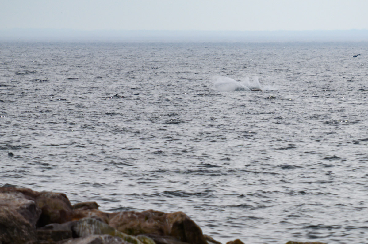 Nous n’avons pas eu à attendre très longtemps. On les voit d’où nous sommes. Elles sautent, tapent la surface de l’eau avec leur queue, avec leurs nageoires. C’est tout simplement merveilleux. Par dessus le marché, elles sont arrivées aujourd’hui.