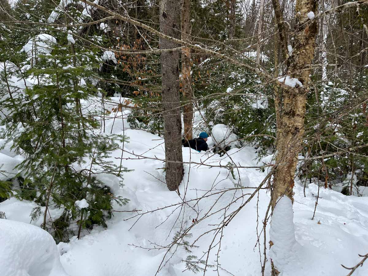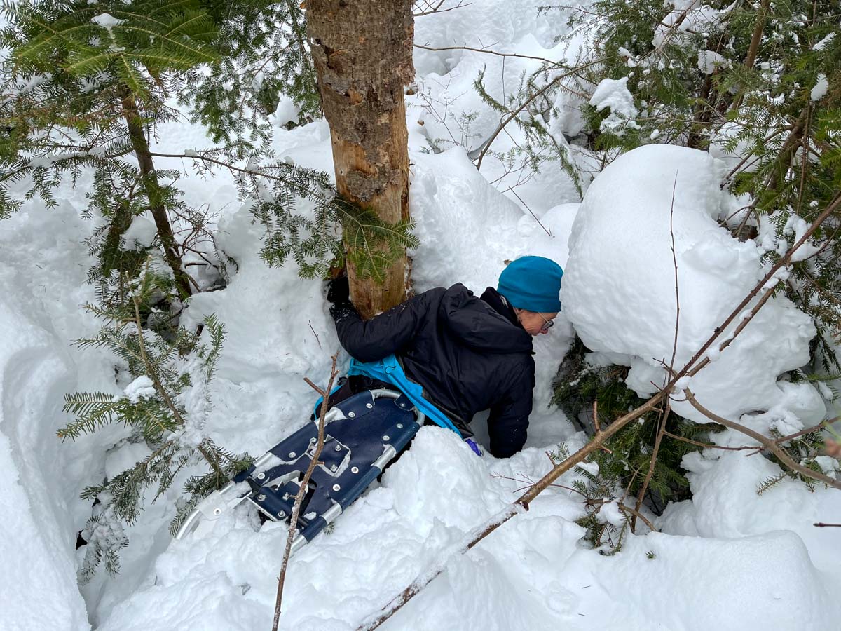 C’est beau randonner en forêt, mais anecdote cocasse, il faut faire très attention lorsqu’on s’aventure dans le bois en raquettes. On ne parle pas de sentiers de raquettes aménagés, on parle de forêt. Attention aux petits sapins. Leurs têtes révèlent d’excellents pièges.