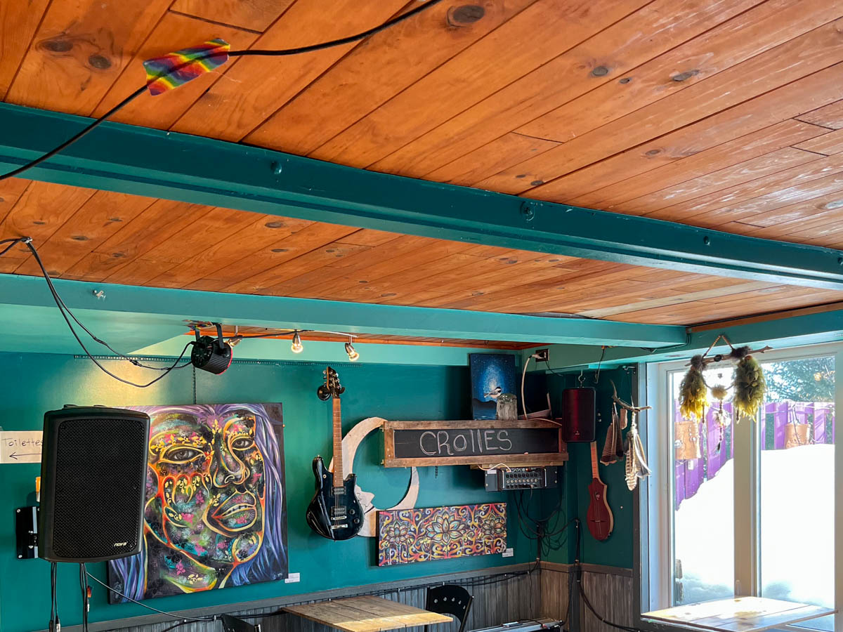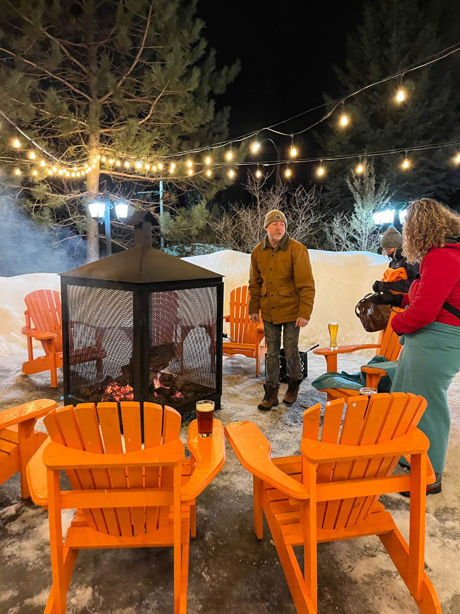 C’est notre prochain point de rencontre et non ce n’est pas un vêtement! C’est le fun, on va rencontrer nos amis vanneux, Natacha et Gabriel (va falloir arrêter de l’appeler Gai-Bri-Elle à la Emily in Paris). C’est eux qui ont choisi ce spot bouffe et bière à Morin Heights : https://www.brasserieanorak.ca/ . On est vendredi soir, et le stationnement est plein. Deux seules vans dans le lot d’autos. C’est le fun l’hiver en van.