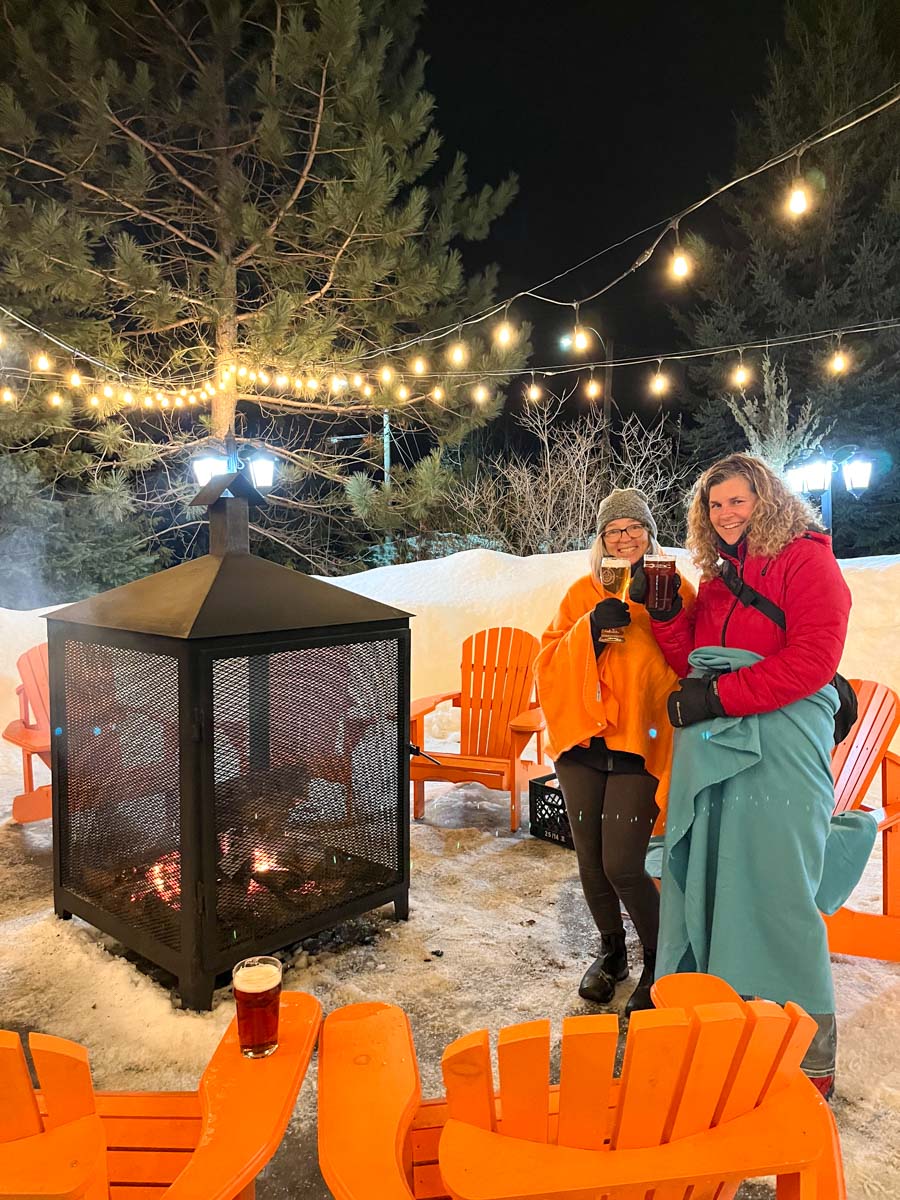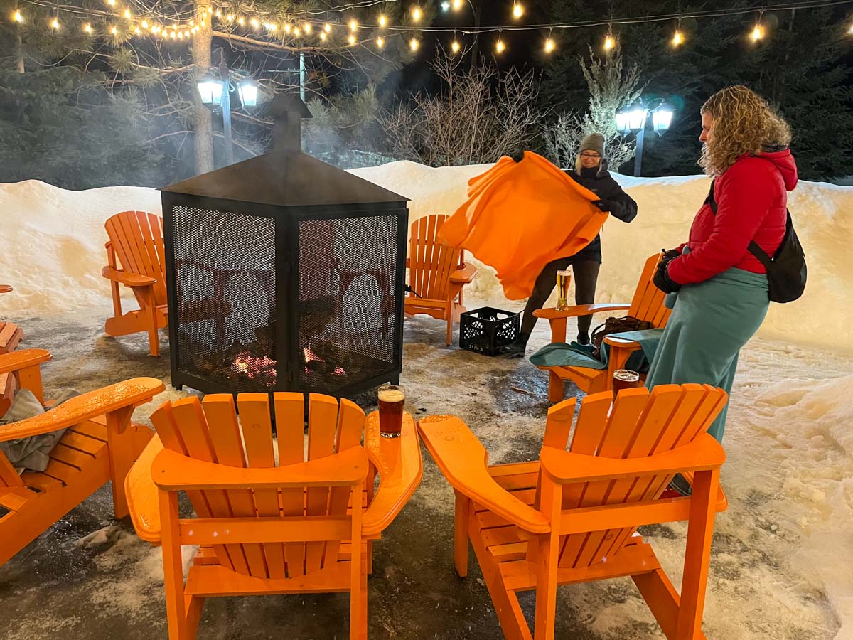 En prime, il y a un feu à l’extérieur, et ils prêtent des couvertures pour s’assoir autour du feu. Comble de malheur pour nous, nos tables ne sont pas prêtes. On doit aller dehors, autour du feu, prendre notre bière. Je suis évidemment sarcastique, on est super content d’être à l’extérieur. La vie est belle!