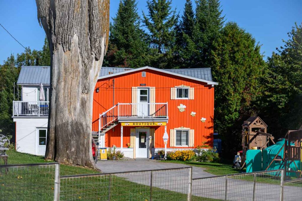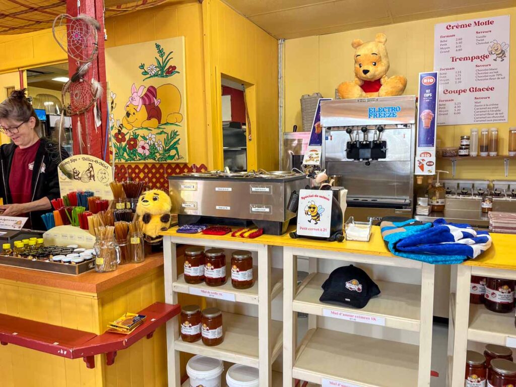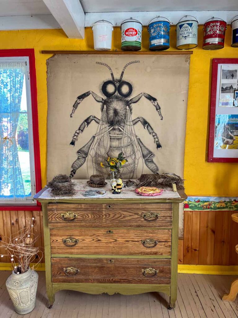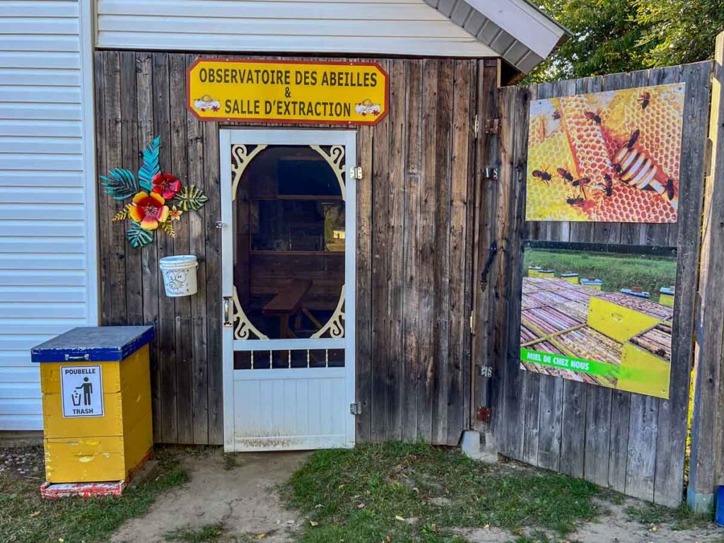Vendredi on avait décidé de se rendre dans un Terego pas trop loin. Il y a plusieurs Terego dans ce coin là, un bon choix d’expérience à vivre, ou de faire des emplettes. C’est toujours le fun aller dans un Terego pour cette raison, car pour le prix d’un camping, parfois plus, parfois moins, tu reviens avec du stock. On avait décidé de se rendre dans une ferme apicole tout près de notre destination finale soit la miellerie Miel de Chez nous à Ste-Mélanie. Ce n’est pas la première que nous en visitions une, je me souviens à Terre-Neuve, lors de recrutement d’hôtes nous avions visité Cormack Bee, mais nous sommes toujours fascinés par le travail des abeilles. C’est un monde passionnant!