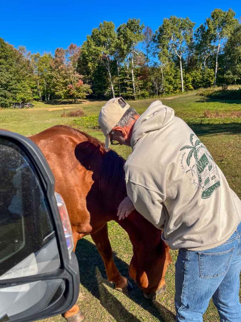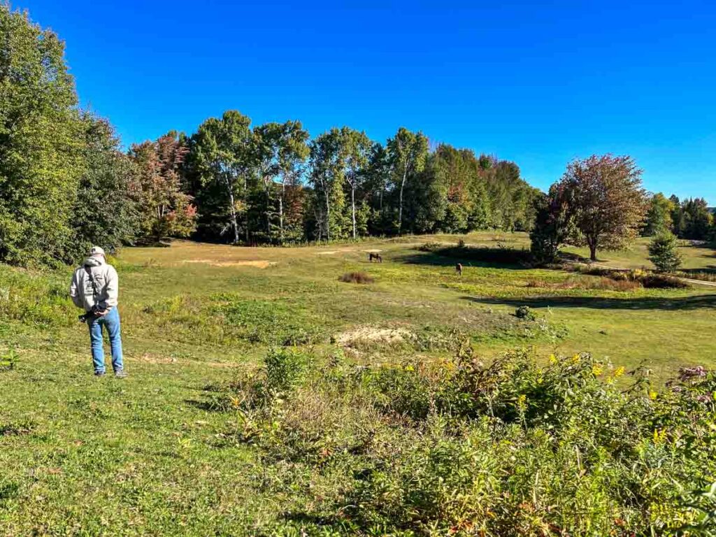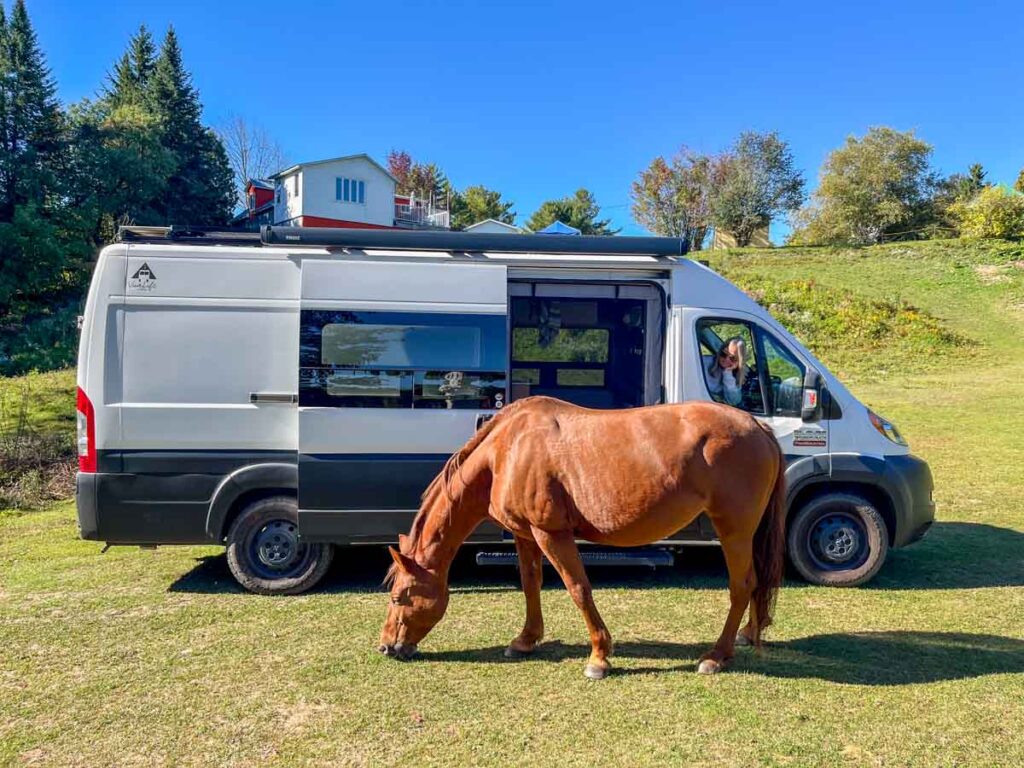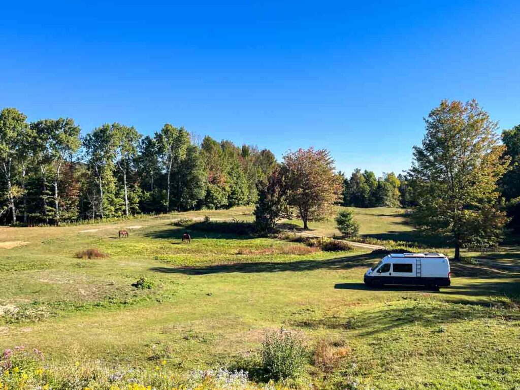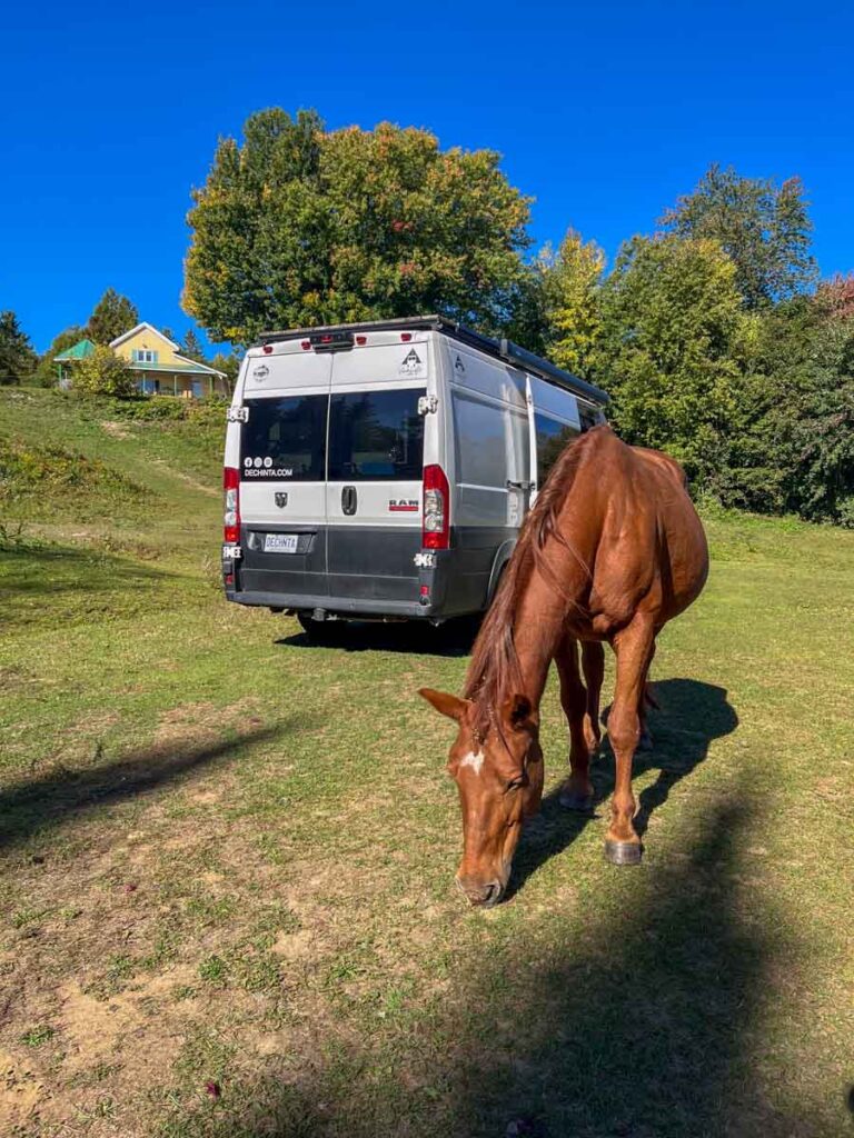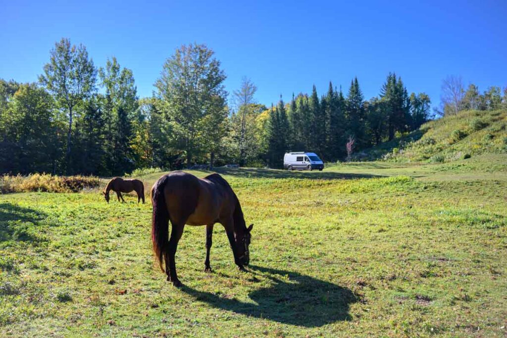 Là c’est tout simplement magique. Le terrain est immense, avec des arbres, un endroit pour faire un feu et le summum, des chevaux en liberté. Ils viennent d’être appelés pour être sellés, alors je ne crois pas qu’on les verra ce soir. On se dirige au stationnement, entouré d’une clôture électrifiée et moins de 30 secondes plus tard on peut aller se promener. C’est le fun en van, se mettre de niveau est souvent une question de quelques secondes.