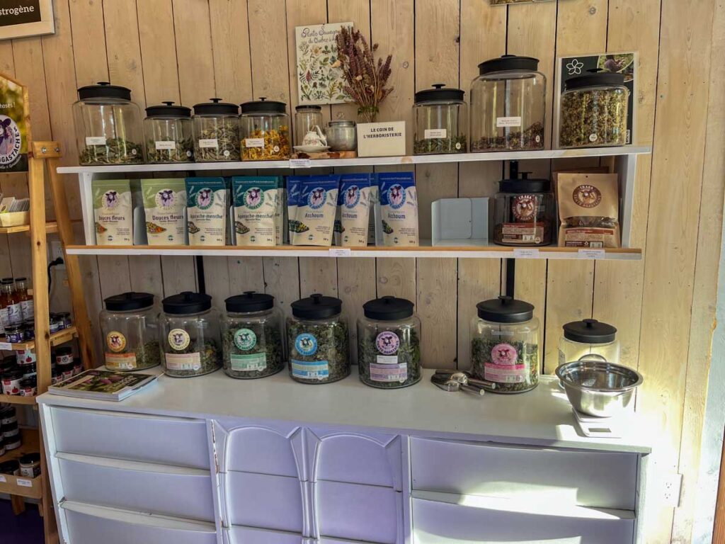 La session de formation de mycologie ne débute qu’à 13:30, on a le temps d’aller faire des emplettes et des découvertes. Deux arrêts intéressants s’offrent à nous: le premier, chez Tante Agastache, où se vend, évidemment, des produits d’Agastache. Cette plante médicinale, prisée par les autochtones, est méconnue mais gagnerait vraiment a être découverte! Avec des propriétés digestives, apaisante et sédative, antioxydante, antibactérienne, anti-inflammatoire…c’est vraiment une plante d’une grande richesse! Avec son petit goût anisé elle est vraiment excellente en tisane. On en a profité pour se procurer la tisane « Atchoum », car il parait que c’est une plante anti-histaminique, et les allergies sont fortes en ce moment, on va voir.