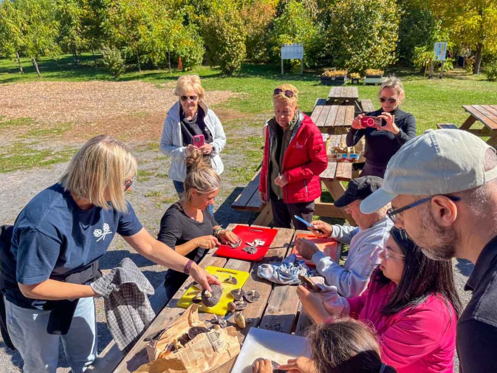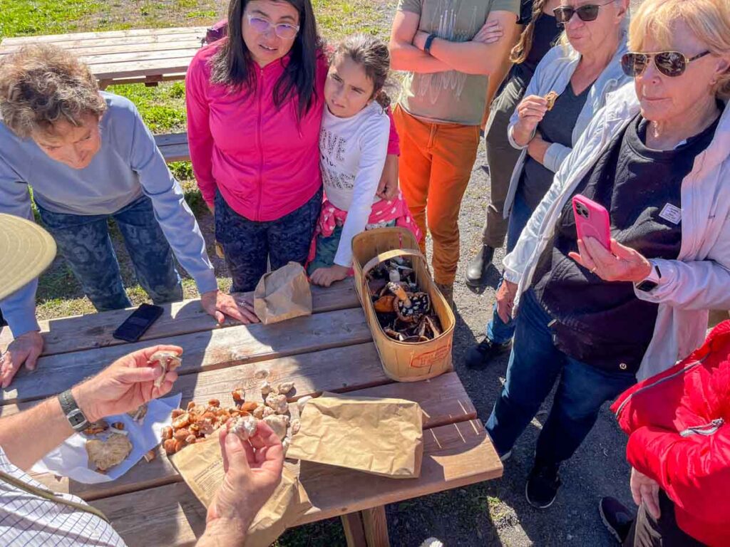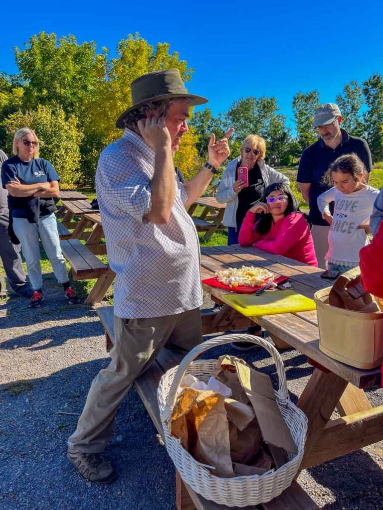 Vient l’heure tant attendue de l’activité; on se regroupe autour de Yvan Perreault (mycologue et spécialiste des comestibles sauvages) pour nous expliquer ce que nous allons faire (l’activité dure tout de même 3 heures) : cueillette, identification, préparation, dégustation. Ça va être le fun.