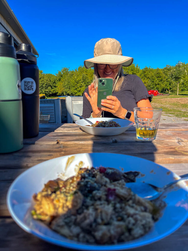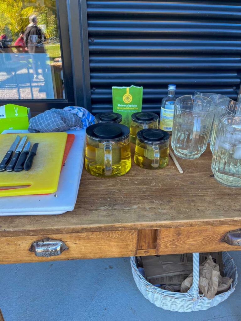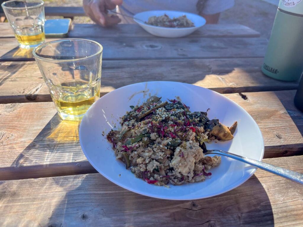 Yvan nous amène ensuite le repas, mais quel délice, tout simplement majestueux. On a découvert les délices du Pourpier (une mauvaise herbe) et le raffinement des fleurs de Monarde! Accompagné d’un hydromel, on en reveut encore.