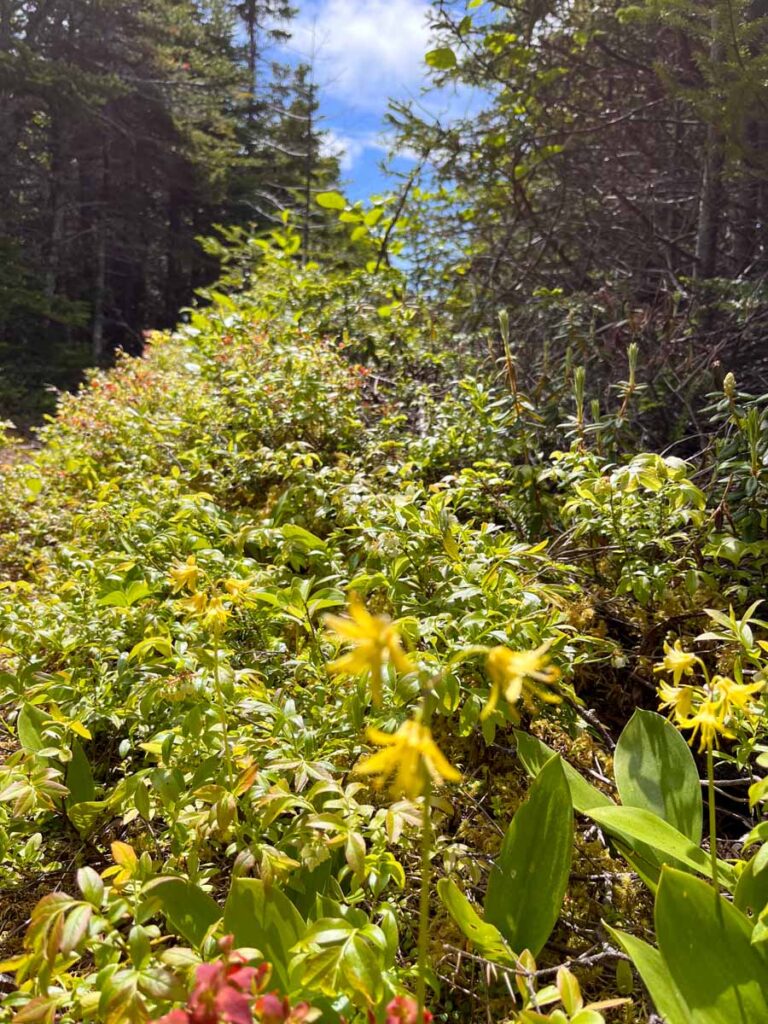 Le sentier est de 10km. Il fait très chaud encore (18). Nous ne sommes pas habitués. On va se faire un petit pique-nique au plus haut sommet et revenir. On part, c’est un beau sentier, peu balisé, mais impossible de se tromper. C’est en forêt, et ensuite en clairière. Il y a beaucoup de moustiques et de petites mouche noires. Nous devons faire un arrêt pour s’asperger (le mot est faible) d’Off.
