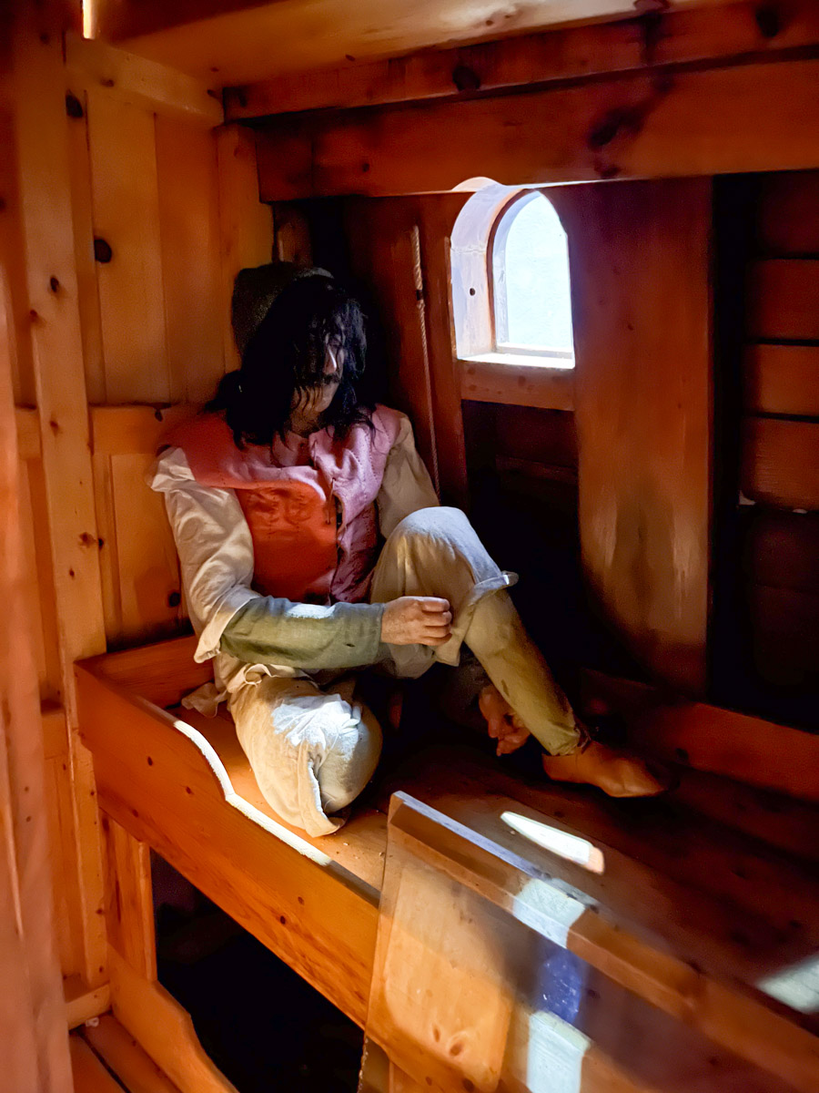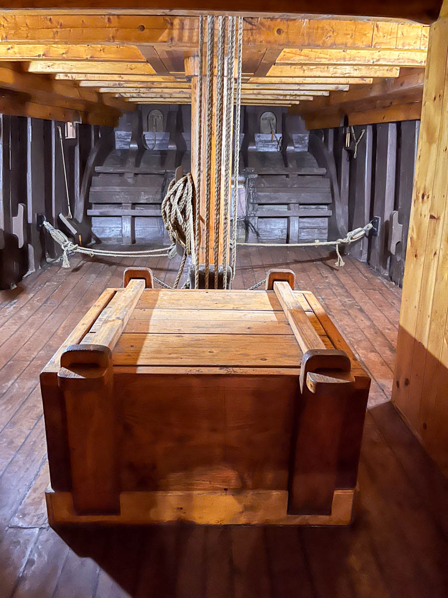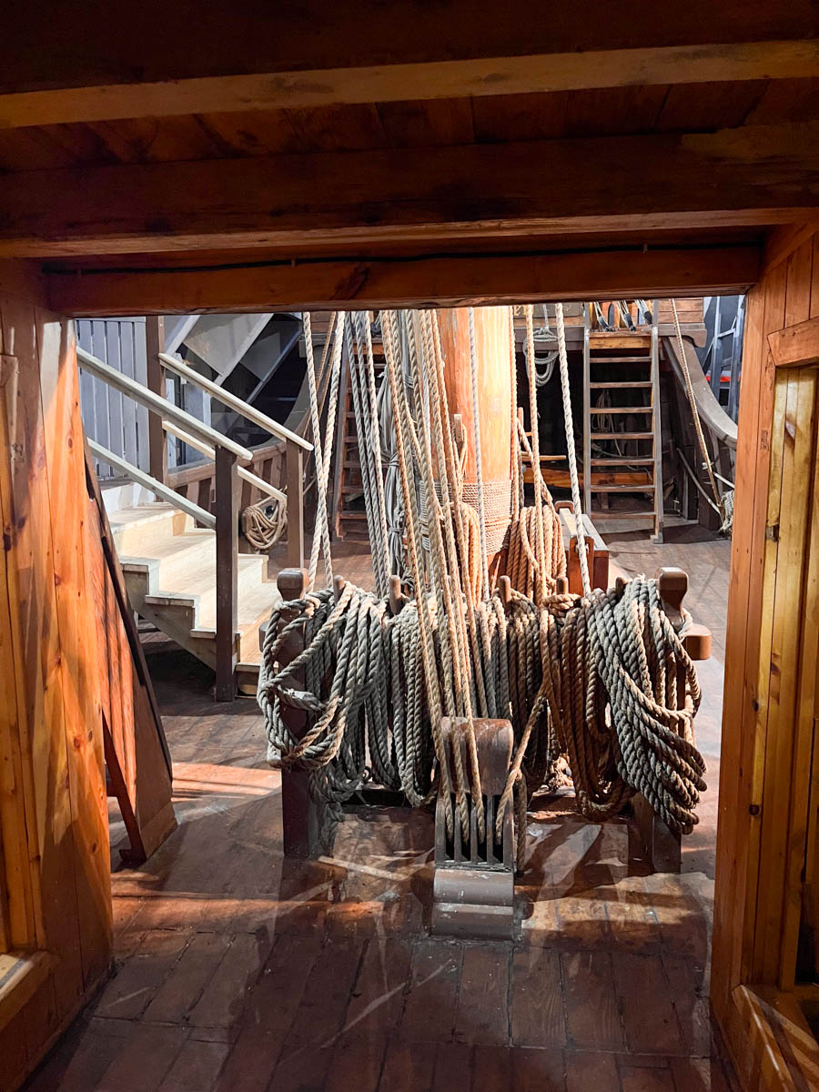 Honnêtement, je n’aurais jamais pris la mer avec ça. Il n’y avait que 3 cabines qui n’étaient pas dédiées aux marins. Eux, ils couchaient par terre, où ils le pouvaient. Aucun chauffage à bord (on sait qu’il fait froid à Terre-Neuve), ça devait donc être pénible. La réplique est maintenant en permanence à l’intérieur, car, exposée aux intempéries, elle devenait de plus en plus endommagée. Monter dans ce bateau, qui a déjà vogué (pas très loin de Bonavista), ben je me sentais comme un ti-gars avec son plus beau jouet. J’ai toujours adoré les voiliers.