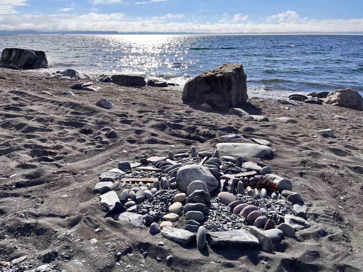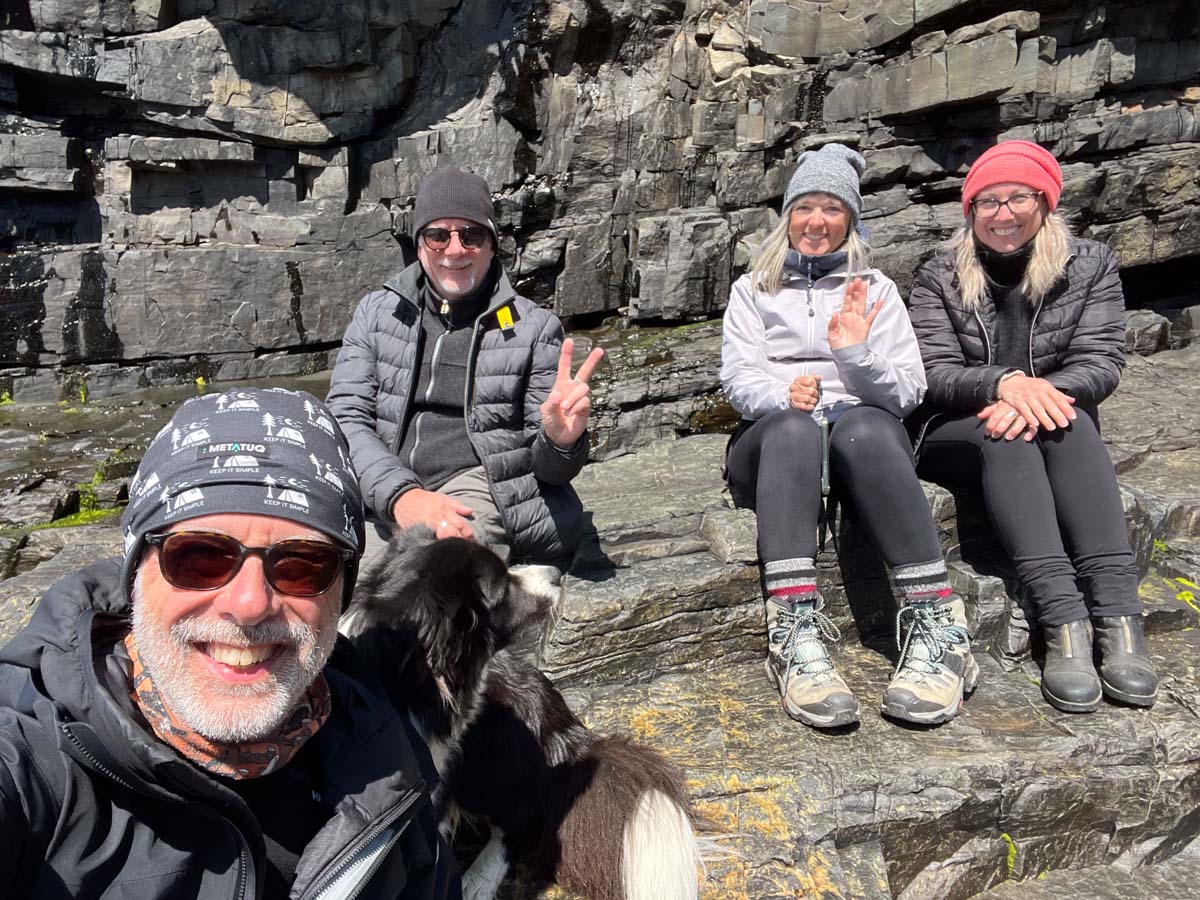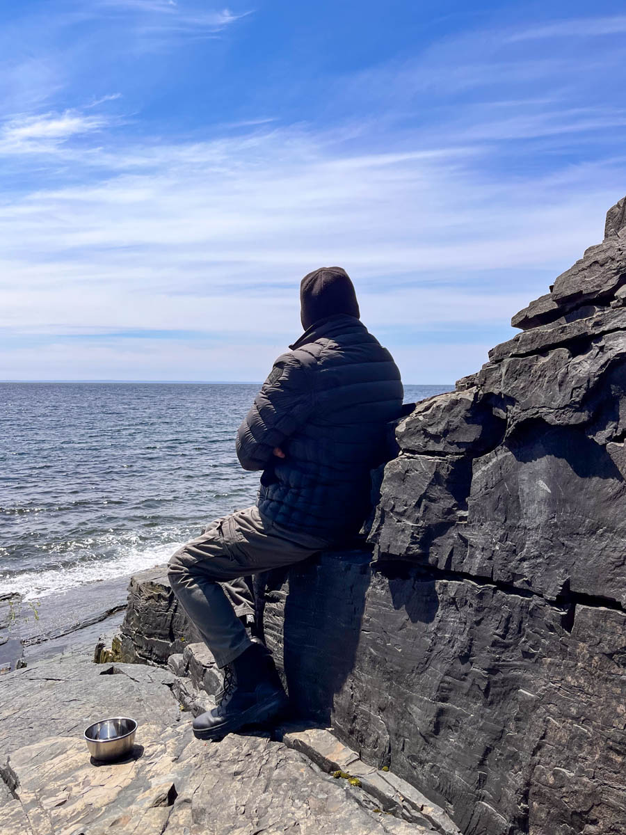Le spot est super beau. On va tout simplement faire un petit pique-nique, et surveiller les baleines. Ils sont super généreux de nous montrer ce magnifique endroit. On se rend au pied d’une anse, à l’abri du vent, car, bien sûr, nous avons encore nos tuques. Il a fait chaud le 24 juin, et il devrait faire chaud dans quelques jours, ou semaines, qui sait.