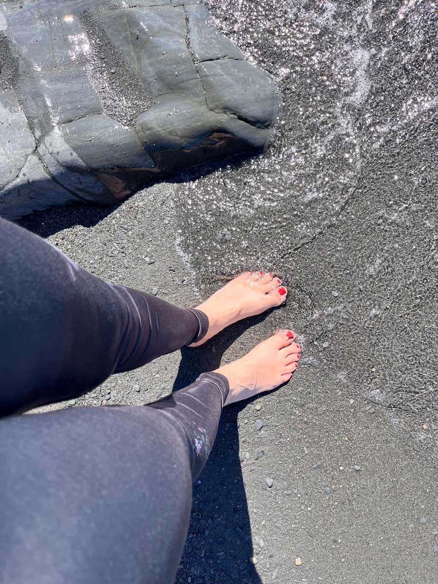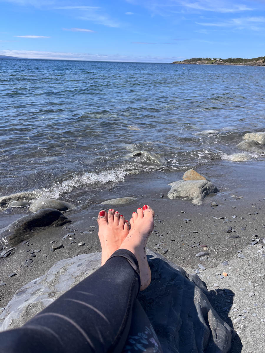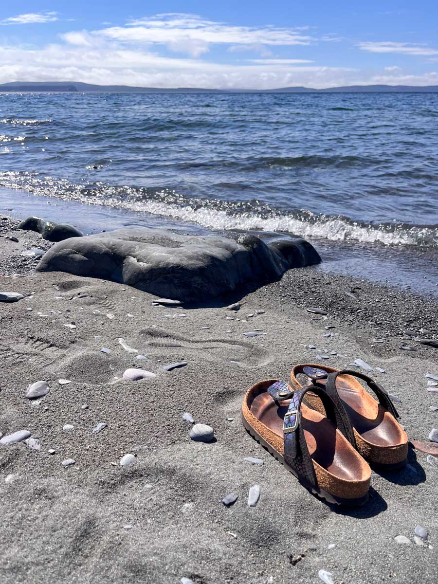 Louise se déchausse tranquillement, on est maintenant en sandales, et on se risque à mettre les pieds dans l’eau glacée.