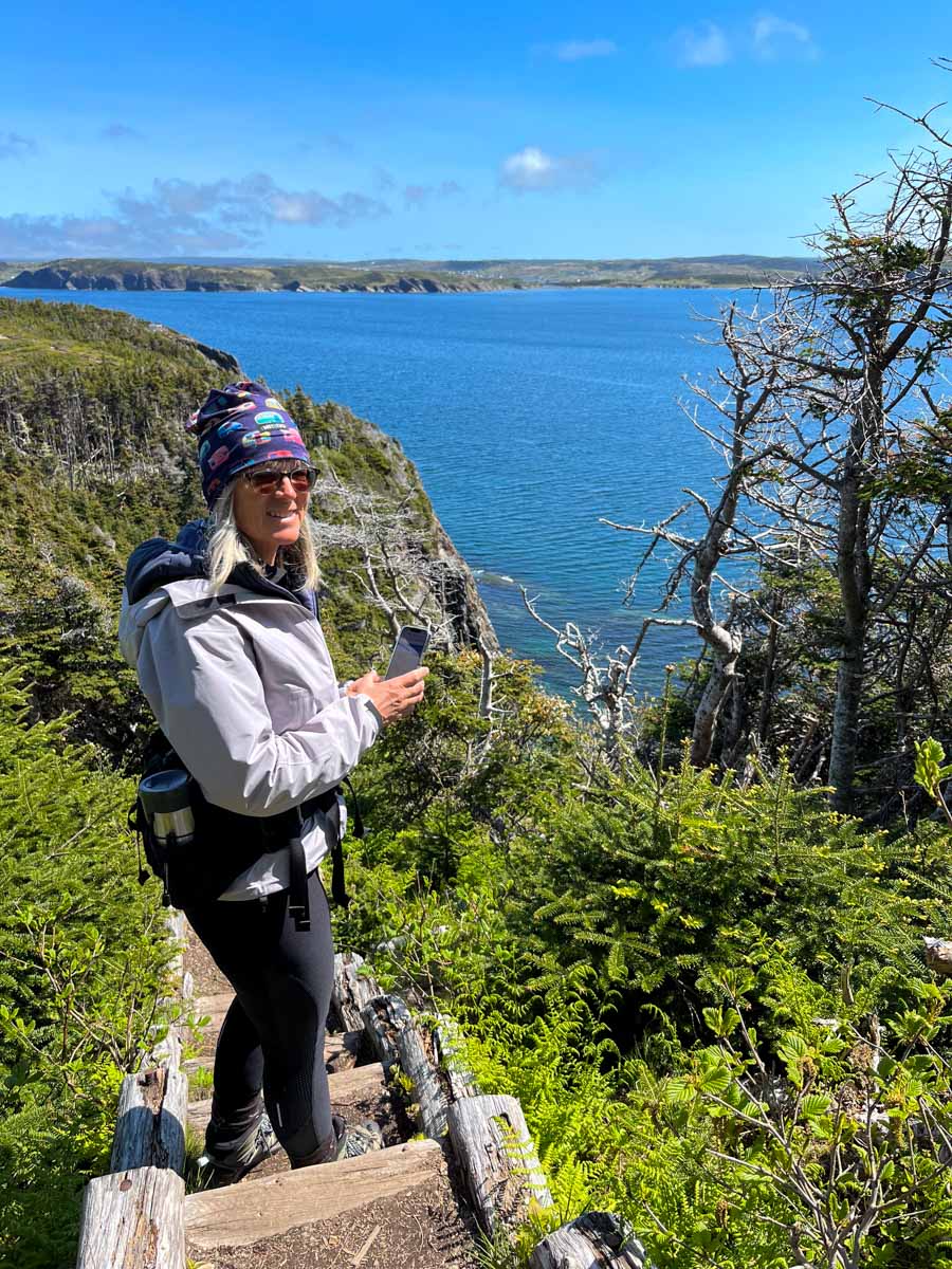 Après un dernier arrêt au Foodland, direction Skerwink. Il fait beau, même un peu chaud (on ne parle pas de 26 ici, mais d’environ 10). Il paraît que ce sentier est l’un des 35 plus beau au Canada. On y va. Il est à peine 10 heures et le stationnement est plein. On peut se mettre sur la rue, et je remarque plusieurs autres endroits autorisés pour se stationner.
