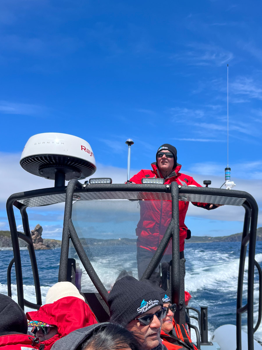 L’heure de l’expédition arrive, on y va. C’est un équipage hétéroclite. Nous étions 11 sur le bateau, ce qui est beaucoup. Les gens provenaient des USA, de l’Inde et du Canada. Ils veulent voir des icebergs, nous, on veut voir des baleines. Le capitaine, Chris, est très volubile. Il parle sans arrêt et explique une foule de chose. Malheureusement, je voulais être en avant, j’ai tout en premier, sauf les explications. Pas grave.