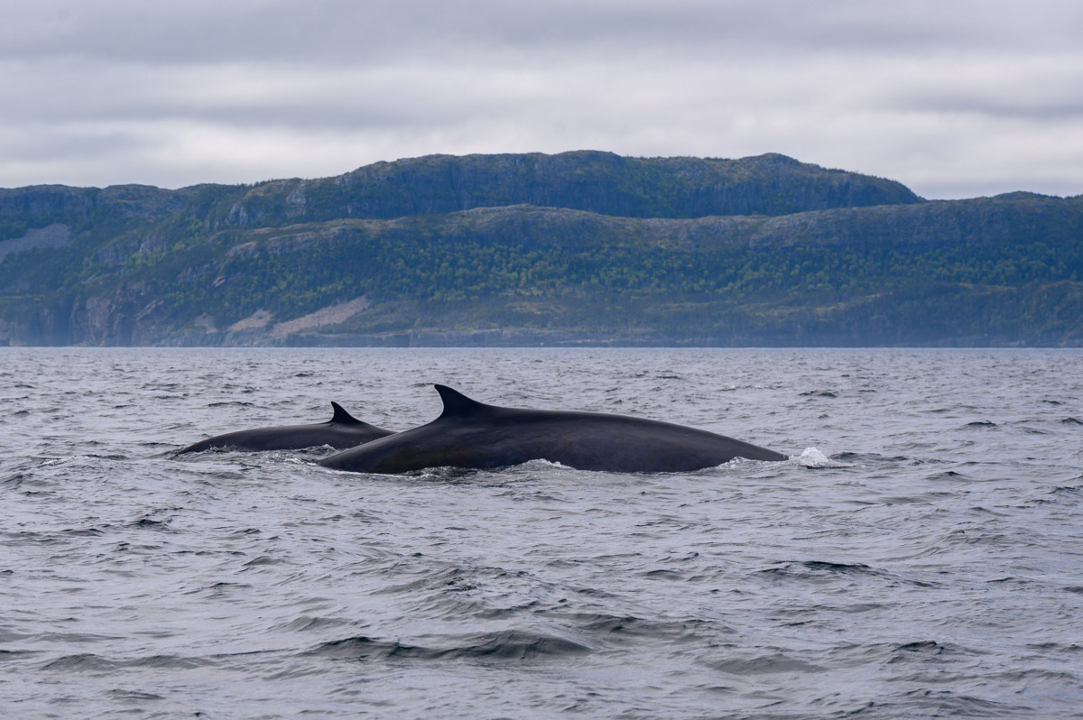 Tout près du moment du retour, il va voir un voilier, au large de New Bonaventure. Le skipper mentionne qu’il a vu des baleines, il y a environ une heure. On va dans cette direction. Les baleines ne se sont pas fait attendre très longtemps. Un beau rorqual avec son petit. Tout juste à côté de nous. C’est une grosse baleine, plus grosse que celles vues à St-Siméon l’an dernier.