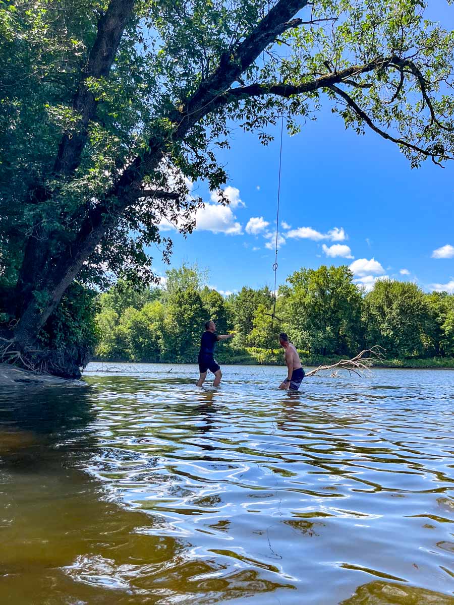 On devra descendre le 8km, mais on a le vent dans la face, solide, on sait que ce ne sera pas de tout repos. On s’est apporté un picnic, et on pataugera dans les iles. C’est un pur plaisir. Quelques plages isolées, des petites criques, et même une corde à Tarzan, un peu trop courte pour nous, mais on s’amuse, et c’est ça qui est le fun.