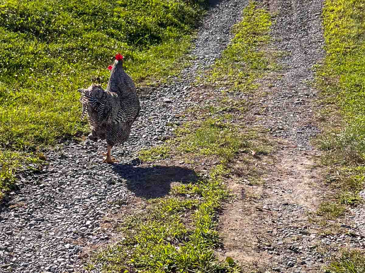 J’avais oublié, les affiches de limites de vitesses font mention d’enfants et de poules en libertés. C’est bien vrai. Les deux se promènent comme bon leur semble.