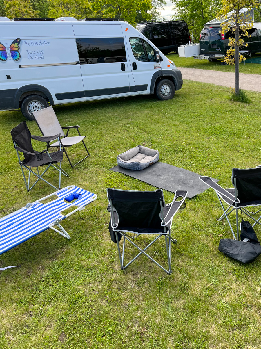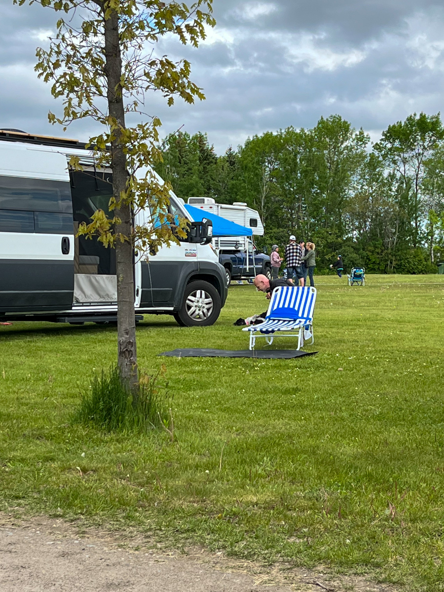 Il y avait quelques activités sur le site. Ces activités devaient être extérieures, mais l’incertitude de la température a obligé les organisateurs à déplacer le tout à l’intérieur. Ben c’est cool au moins ça a lieu, et pas d’annulation. Natacha et Louise sont allés. au programme : session de yoga, suivi d’une session de boxe, et finalement en PM, une session de HIIT. Il faut comprendre que les vanlifers ont un soucis de leur santé, ironique quand même (ben des km assis dans la van). Je suis allé les voir « travailler », en attente de la session de boxe où je devais y participer. À les voir aller, je me suis dit que la boxe serait KO, et j’avais raison. Elles étaient finies. Les deux Martines n’y sont pas allées, autres priorités/exercices. Finalement, un choix judicieux.