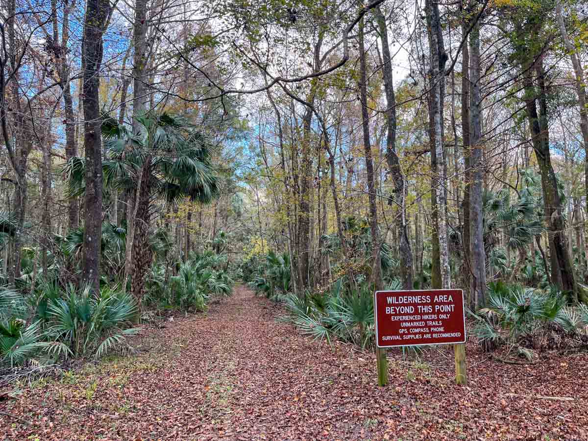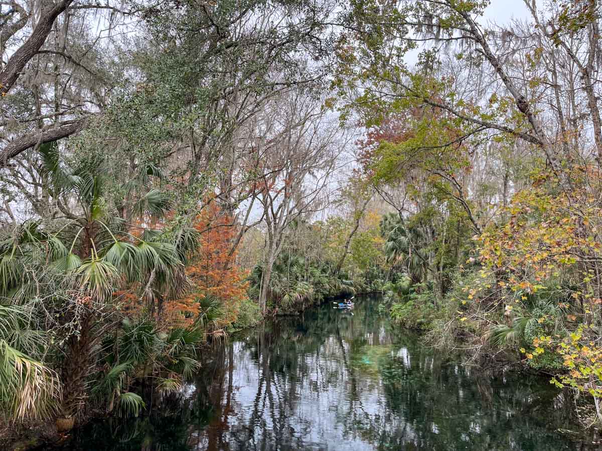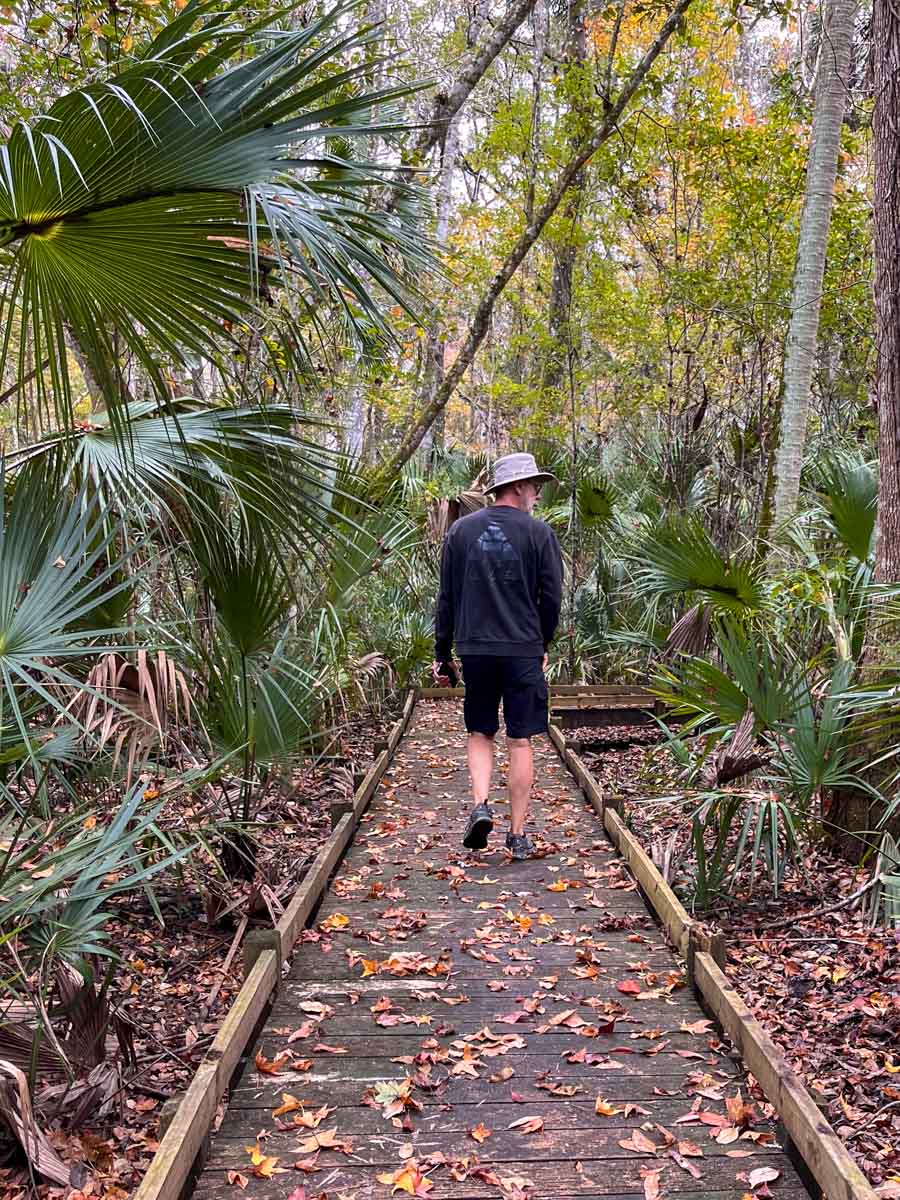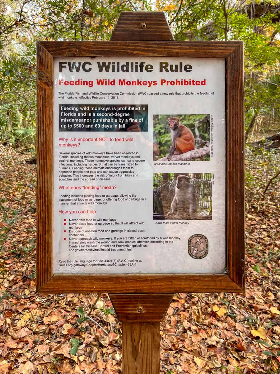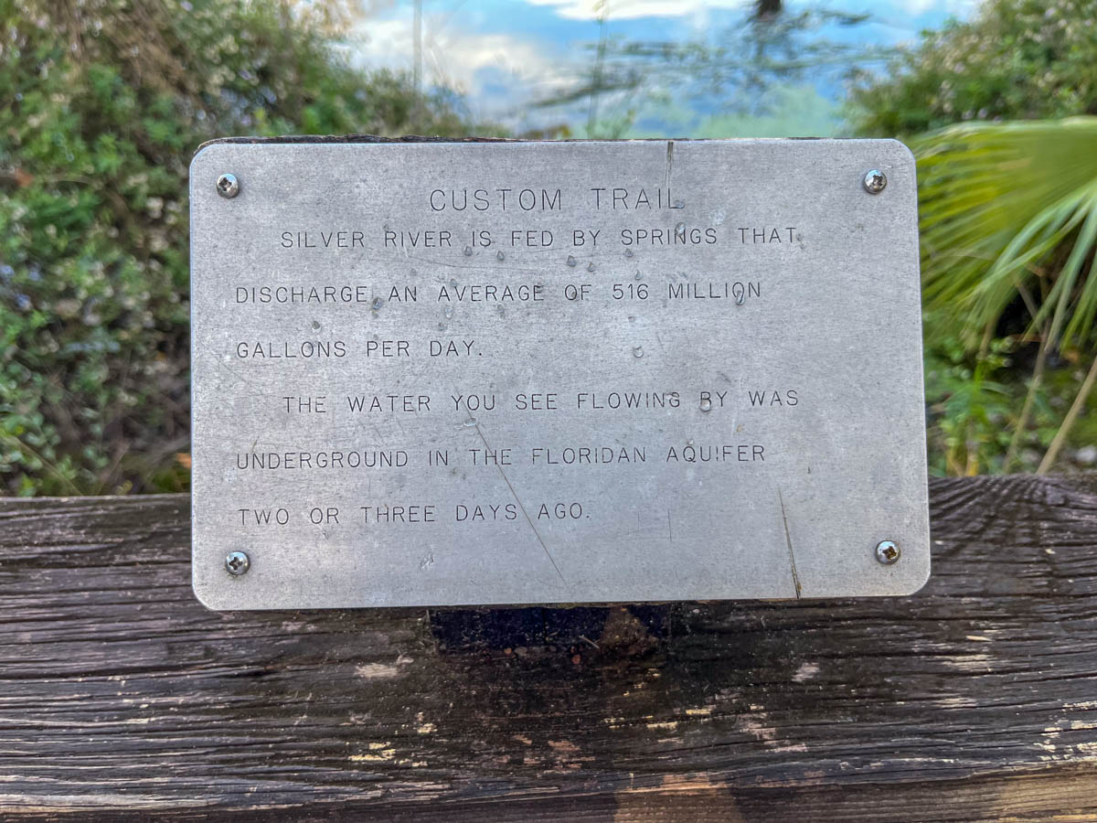 À peine arrivé, on se dépêche, on veut aller voir la spring. Surprise en entrant dans les sentiers, il ne faut pas nourrir les singes. Nous avons deux missions, voir la spring, mais surtout, voir les singes. On arrive par la Swamp Trail, beau débarcadère pour kayaks et paddle, on se rend à la River Trail, toujours beau, et on tente de se rendre à l’entrée. Sur une affiche on constate que de la Silver Springs jaillit plus de 512 millions de gallons d’eau par jour. C’est une eau pure à 99.8%. C’est assez impressionnant. Mais après 5km, nous sommes encore loin, et il fera noir dans une heure. On rebrousse chemin. Finalement, pas vu de singes, mais plein d’odeurs : odeur de pipe, odeur d’un fleuriste, odeur de canelle, odeur de forêt, odeur de pins.