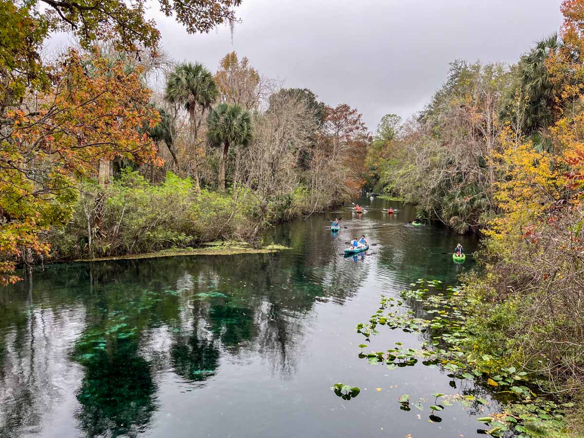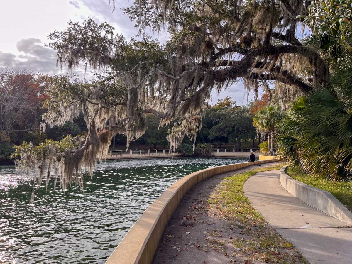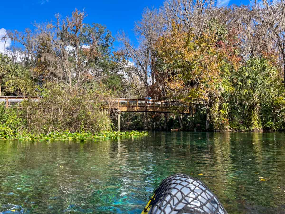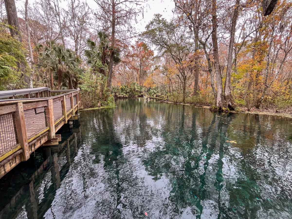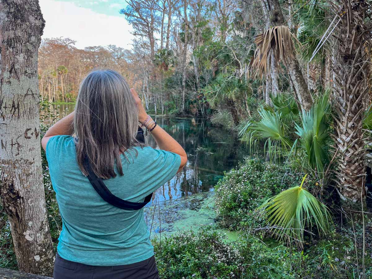 À peine arrivé, on se dépêche, on veut aller voir la spring. Surprise en entrant dans les sentiers, il ne faut pas nourrir les singes. Nous avons deux missions, voir la spring, mais surtout, voir les singes. On arrive par la Swamp Trail, beau débarcadère pour kayaks et paddle, on se rend à la River Trail, toujours beau, et on tente de se rendre à l’entrée. Sur une affiche on constate que de la Silver Springs jaillit plus de 512 millions de gallons d’eau par jour. C’est une eau pure à 99.8%. C’est assez impressionnant. Mais après 5km, nous sommes encore loin, et il fera noir dans une heure. On rebrousse chemin. Finalement, pas vu de singes, mais plein d’odeurs : odeur de pipe, odeur d’un fleuriste, odeur de canelle, odeur de forêt, odeur de pins.