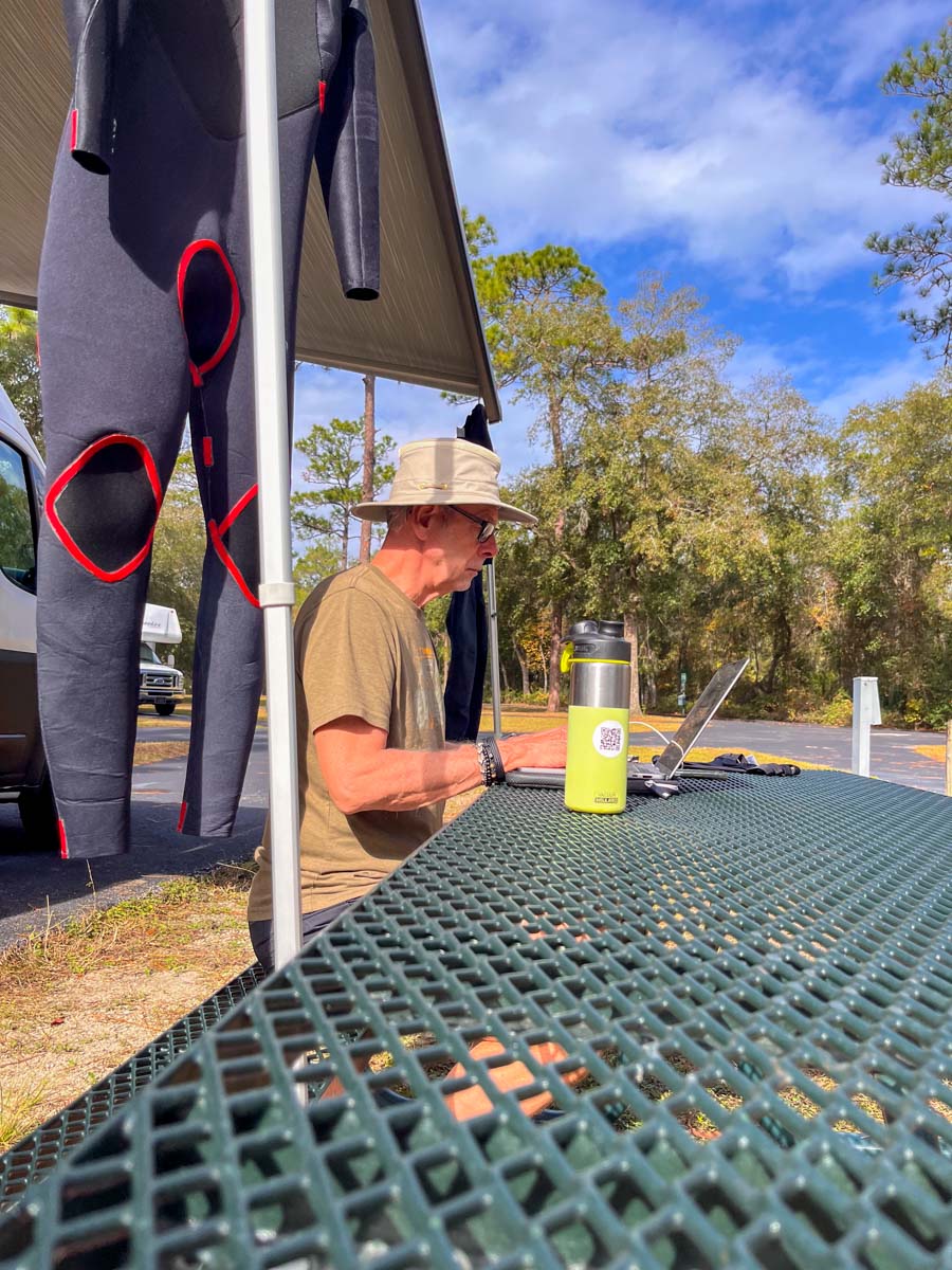 Retour à la van, souper, et recherches d’endroits à dormir. Les State Parks que nous visitons sont souvent des annulations faites par des campeurs. C’est pour cette raisons que nous sommes ici que 2 nuits. C’est souvent plein. Mais, étant donné que nous ne faisons pas de plan de route, juste pour le fun, je regarde les disponibilités du parcs, parce qu’il y a beaucoup d’activités à faire ici. Surprise, notre terrain s’est libéré jusqu’à vendredi. À 28$ la nuit (plus 7$ pour les services), on reste jusqu’à vendredi. Plus aucun stress pour faire du kayak, des marches, du vélo…