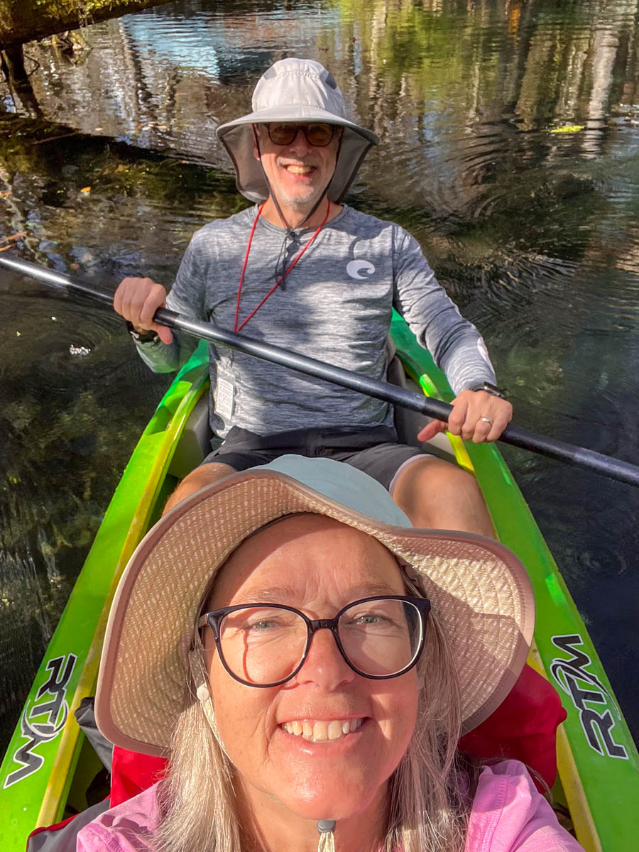 On mange tôt, pour aller en kayak. On y va en vélo, avec nos sacs étanches. Il est possible de laisser nos vélos tout près et c’est très surveillé. Location tandem, 2 heures pour 55.00$. C’est magnifique. On voit, dans une eau cristalline, poissons, lamantins, alligators, tortues, et à la surface : anhinga, ibis, aigret, héron bleu. Et pourquoi pas des bananiers, avec des bananes. Le courant est tout de même assez fort, pour de l’eau qui vient de l’aquifère. Deux heures de bonheur…
