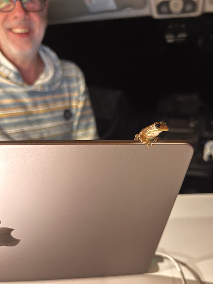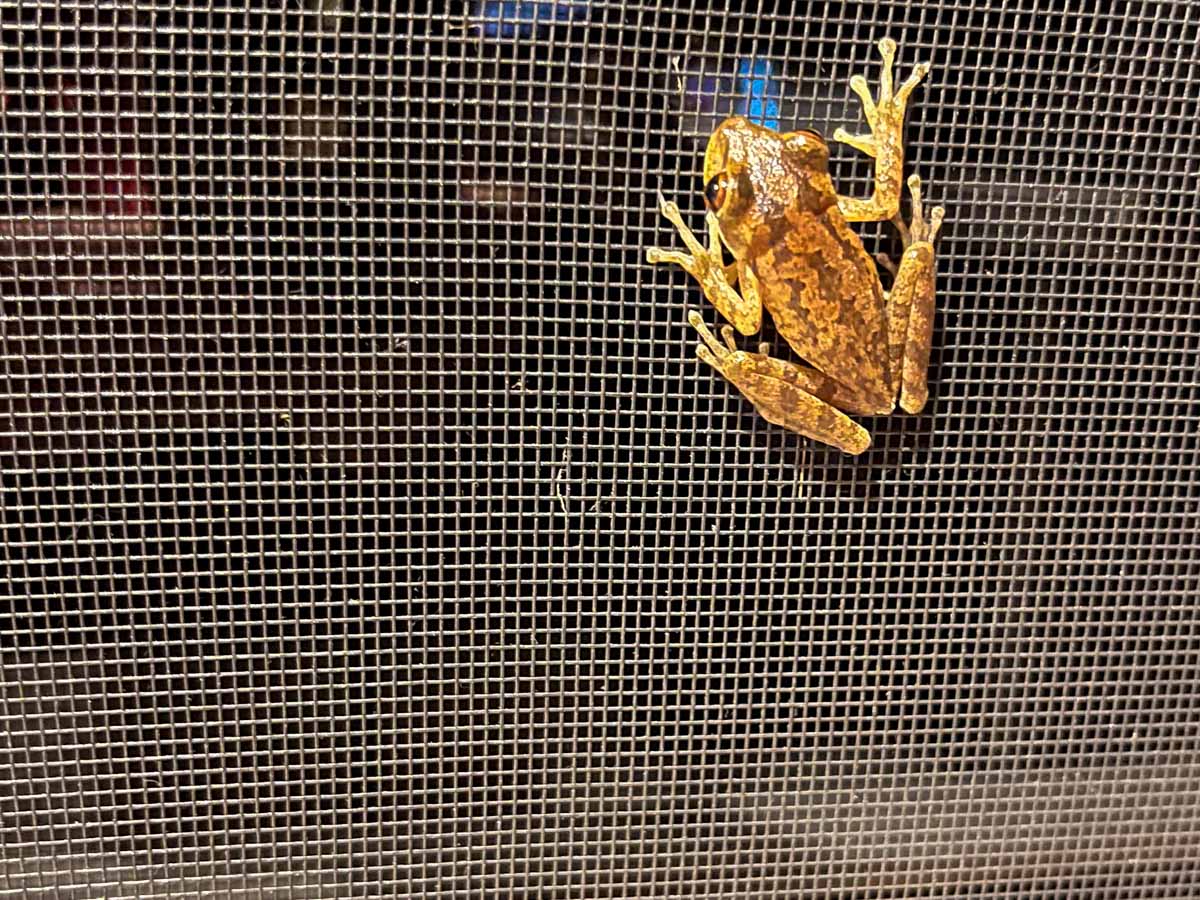 Pendant que j’écris le blog, j’ai eu toute une frousse. Un visiteur s’est immiscé dans notre van, et a décidé de m’accompagner. Hop sur mon épaule, et hop sur l’écran, avec ses grandes pattes toutes collantes. Il ou elle regarde Louise prendre une photo, et hop dans le moustiquaire. Ce sont de longs sauts. Louise sait qu’il y a des grenouilles vénéneuses ici, faut pas les toucher. Un verre clair, elle se dirige au fond, et out. Il y des insectes à manger dehors, il n’y a rien à l’intérieur pour toi, du moins, je l’espère de tout coeur.