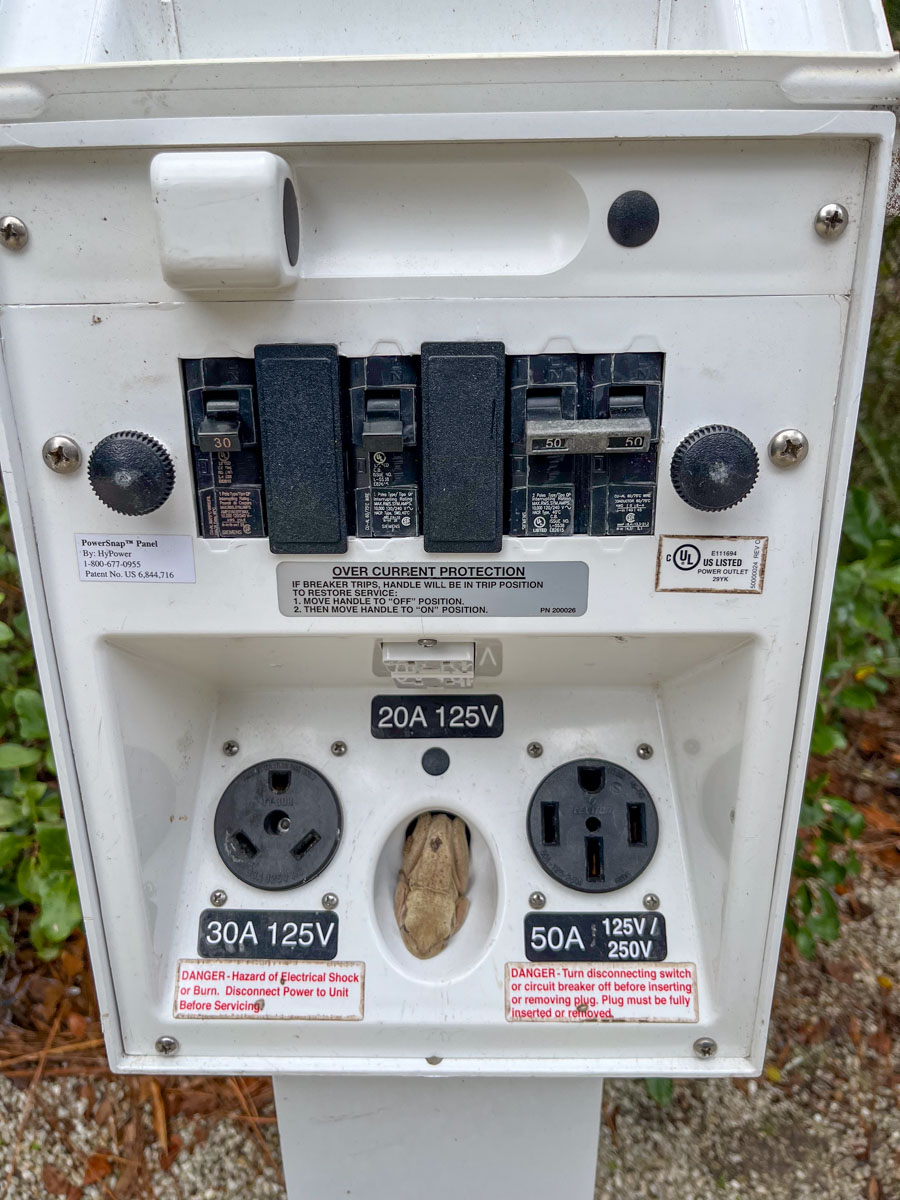 On se rend à notre terrain, le 19. Le MEILLEUR et de loin. Près des toilettes, bien isolé. Il y a même une grenouille qui se réchauffe dans le panneau électrique.