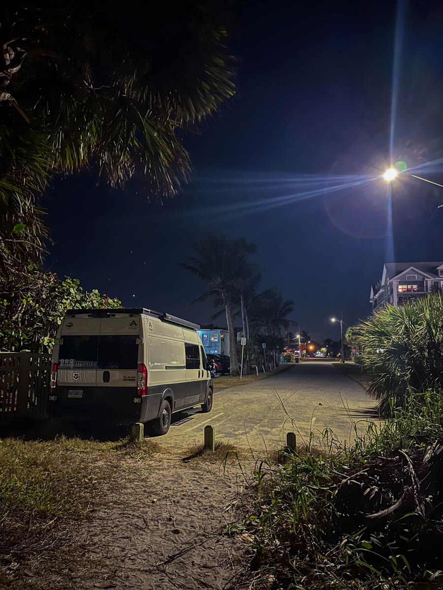 Enfin, on peut se trouver un endroit où dormir. Ce travail n’est pas de tout repos, mais j’ai trouvé un spot de la mort, sur recommandation. Attention, car à Cocoa Beach, le camping de nuit est interdit dans leurs stationnements publics.