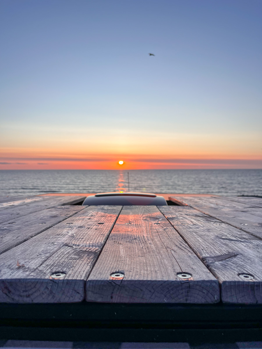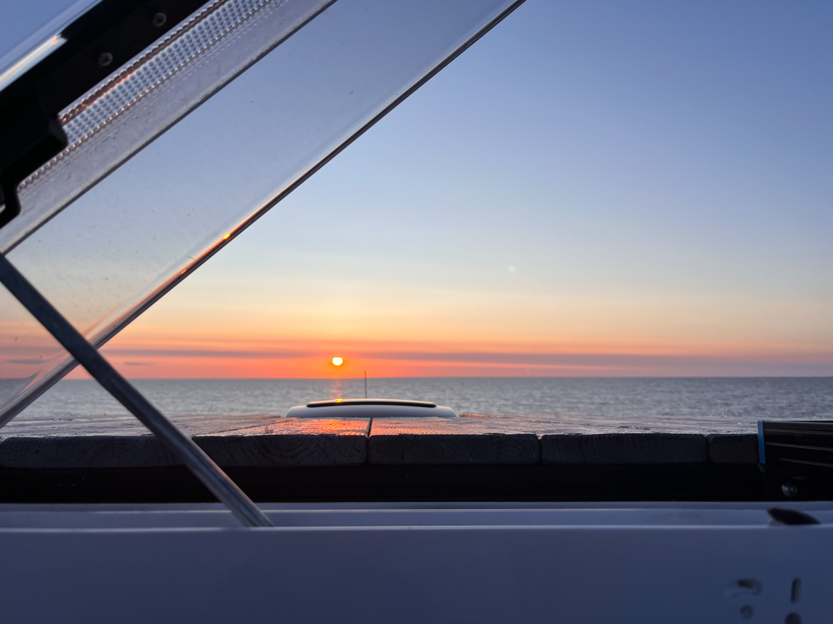 Un autre coucher de soleil à faire envier les autres. Il a fait très chaud, 12, on est bien. Demain on se rend au village Viking.