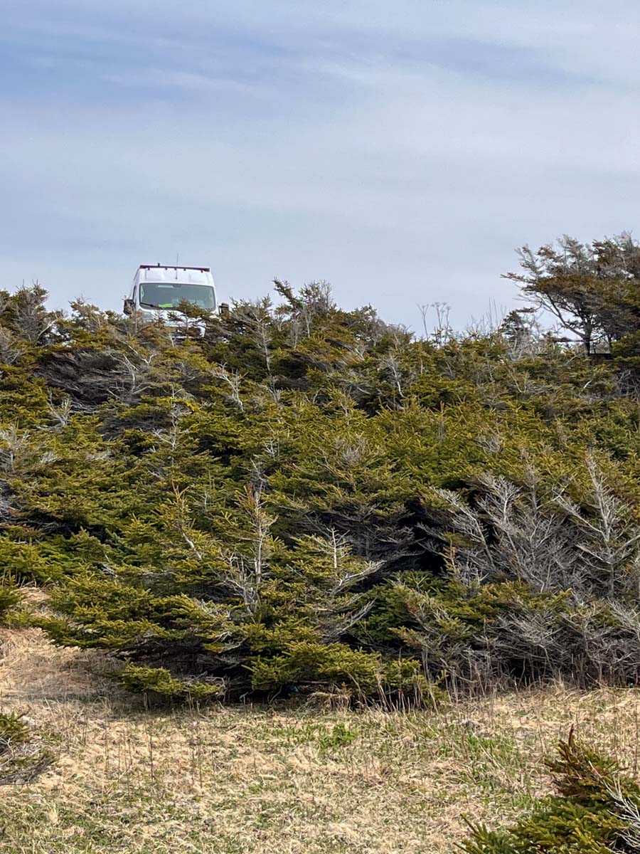 Il est super gentil, me conseille de me mettre dans une direction. On s’installe. La vue est spectaculaire. Il y a un gigantesque iceberg au loin, on voit toute la baie, ça vaut une fortune cette vue (dans le sud peut-être, mais ici, pas certain). C’est l’heure du Webasto et d’une sieste. Mais la température ne monte pas dans la van. Il fait froid. Ça c’est une première. Il vente tellement fort, que le vent entre par tous les orifices à l’avant de la van. En fait, n’importe quel trou quoi. On a des vents de 70km/h. La van se promène, c’est particulier, le bruit est incessant. Il vente toujours à Terre-Neuve, mais notre spot, n’est pas le plus adéquat pour un vent du Nord. C’est malheureusement impossible de rester. Je vais dans la boutique, et je leur dit qu’on doit quitter. La dame sourit… Elle connaît ça.