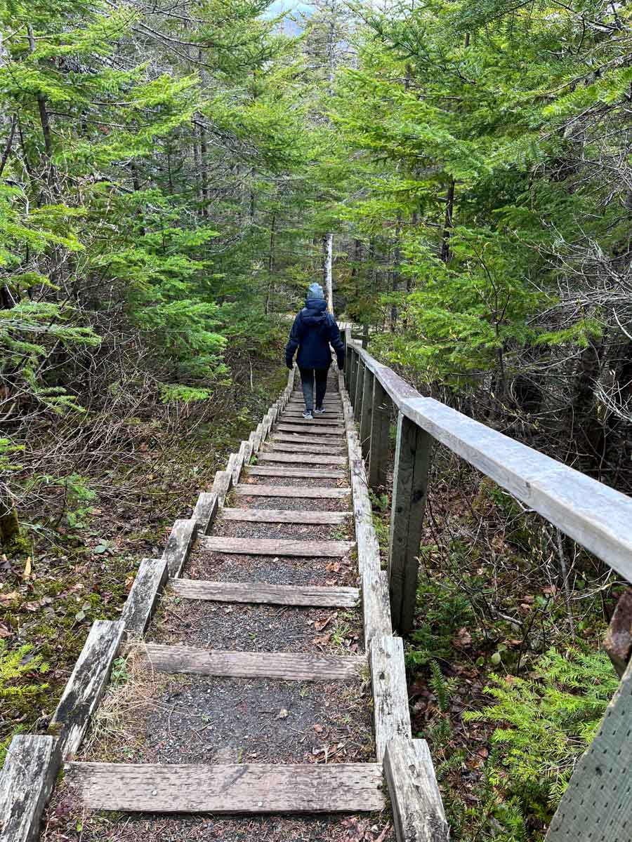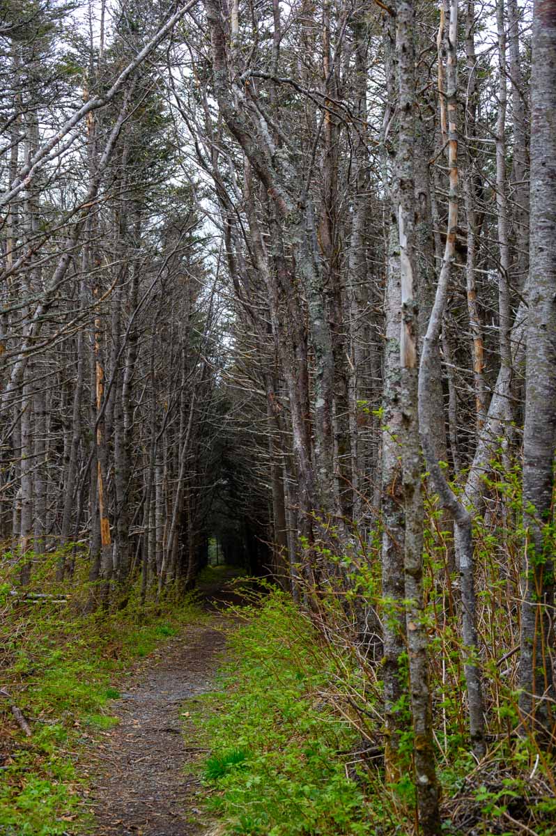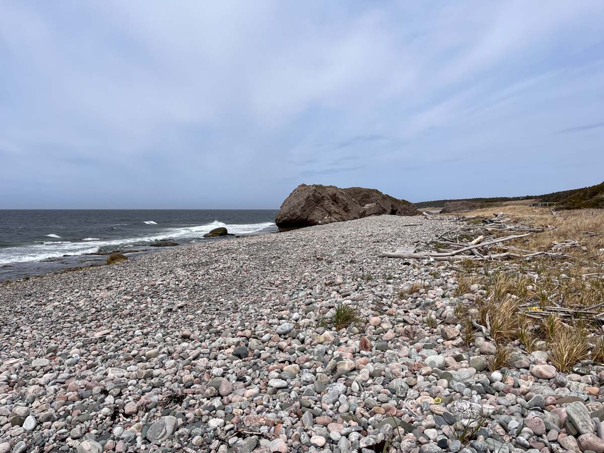 6 km de plaisir. On s’est habillé plus chaudement, et ce sentier suit la côte, entre des arbres, sur des roches, dans un champ. C’était jadis le sentier du facteur entre les 2 communautés : Green Cove et Baker’s Brook. C’est spécial de suivre ses pas.