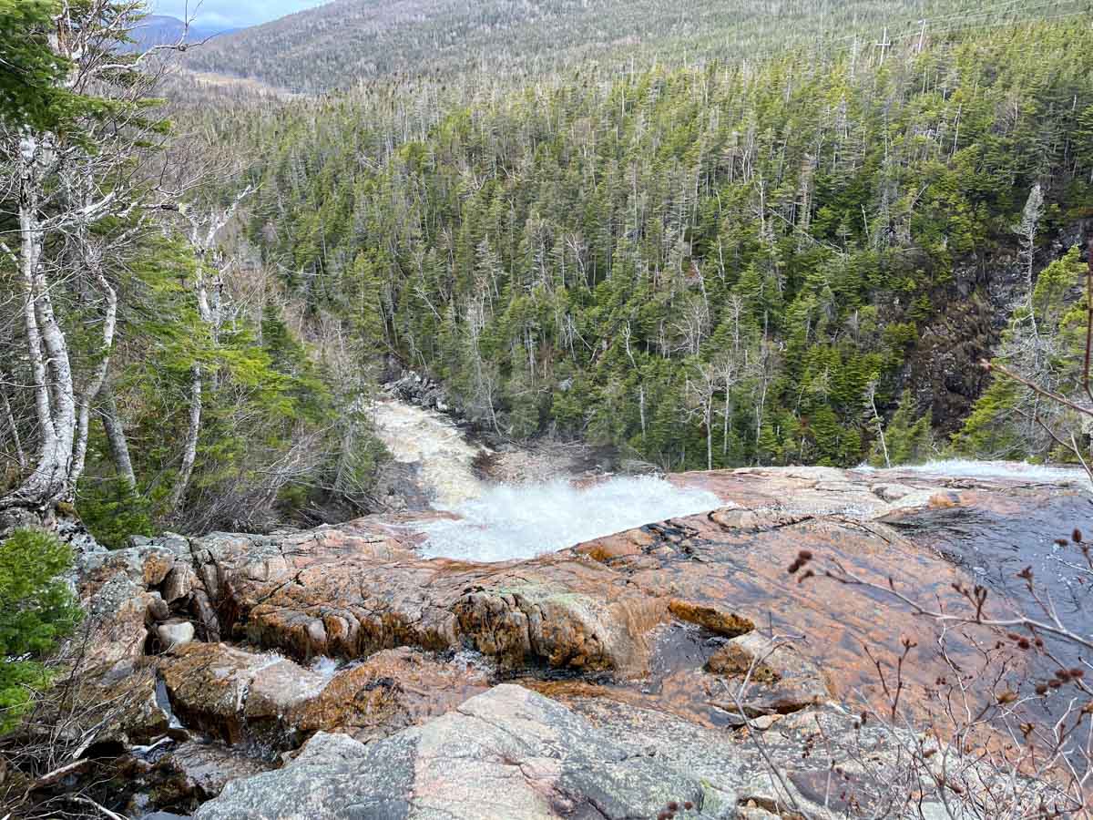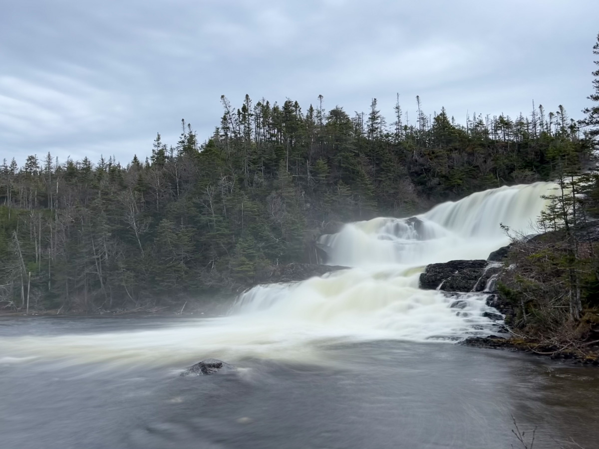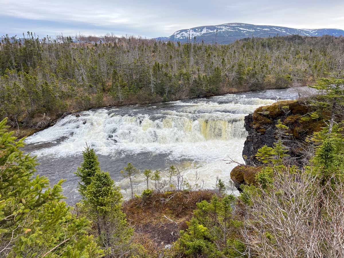 Second arrêt, une chute (South East Brook Falls). Il ne pleut plus, ça tombe bien. Petit lunch et on va faire le sentier. Ce n’est vraiment pas très long, à peine 750m total. On se rend au bout, et c’est une grosse chute. Malheureusement on la voit du haut et non du bas. On ne peut pas l’apprécier dans toute sa grandeur. C’pas grave. On retourne. En tout, 17 minutes, descendre, prendre des photos et remonter. Et il commence à pleuvoir. On est béni.