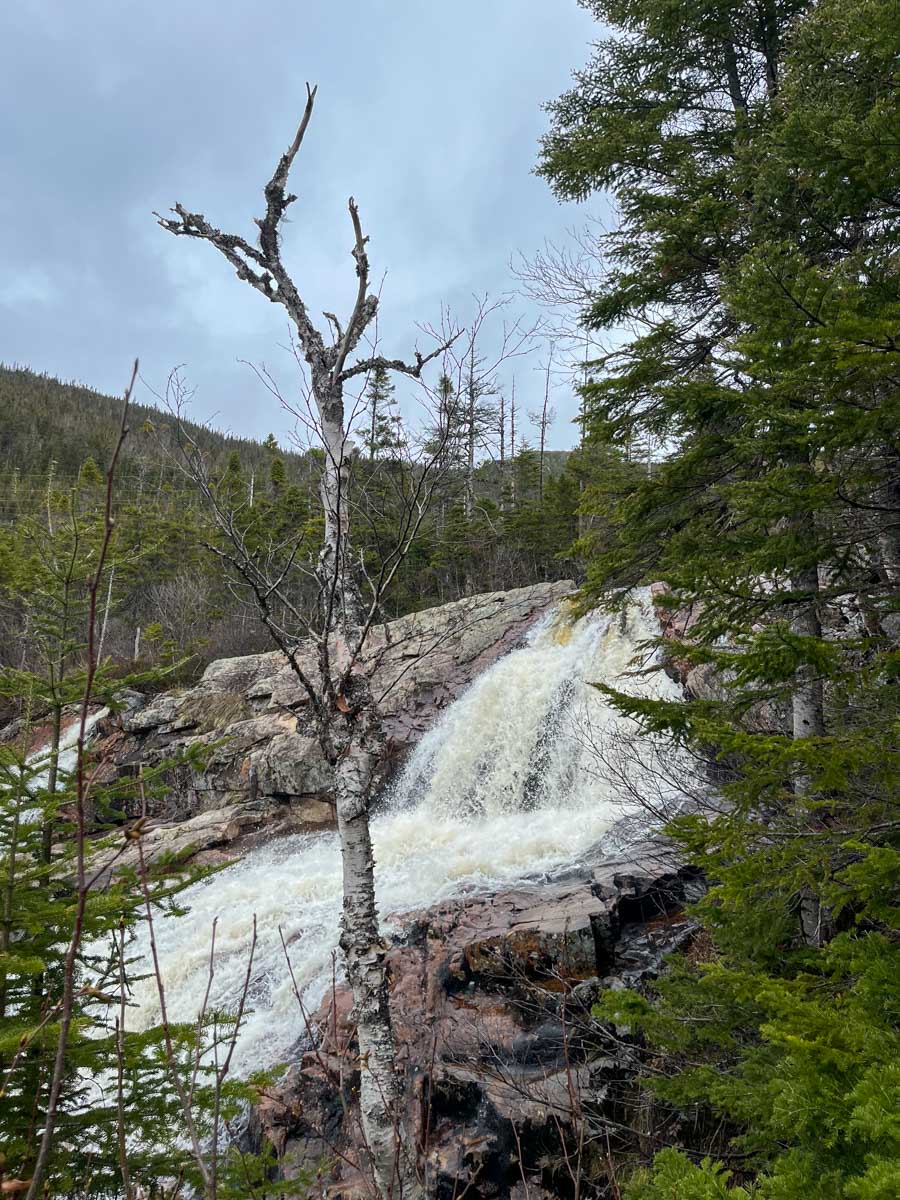 C’est donc un peu plus calme. C’est le fun, il y a trois sentiers qu’on peut faire, à partir de notre van. Ce matin on a décidé de faire un autre sentier de chutes, le Bakers Brook Falls. On y va avec Ann, Louis et Marc-André. On remarque dans le sentier qu’il y a beaucoup de terres ravagées par les orignaux. C’est fous ce que ces animaux peuvent faire comme ravage. Dans le sentier on y retrouve aussi un exclos (on empêche les orignaux d’y pénétrer) qui a été implanté en 2009. C’est fascinant de voir la différence d’une forêt non endommagée. Ce n’est pas très long, mais on voit vraiment l’impact.