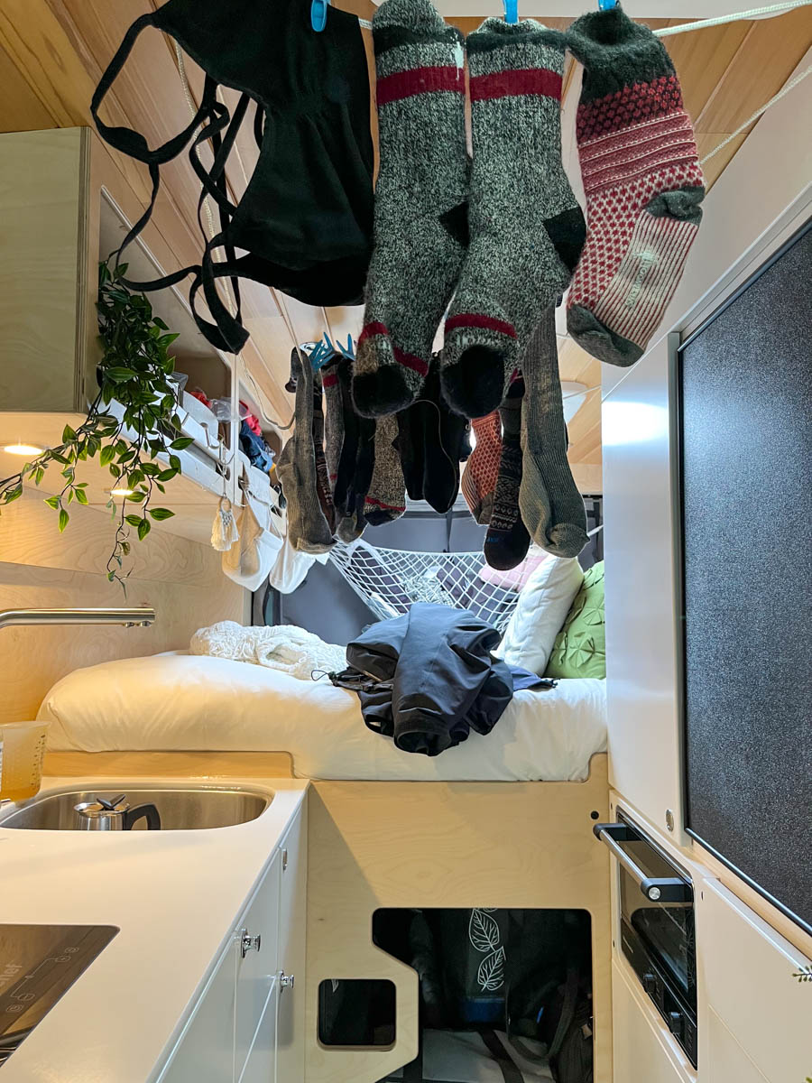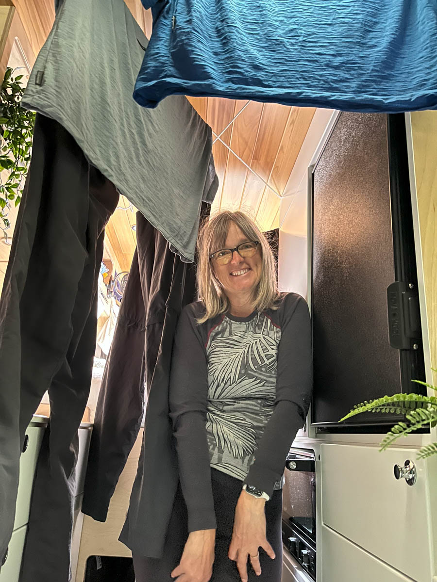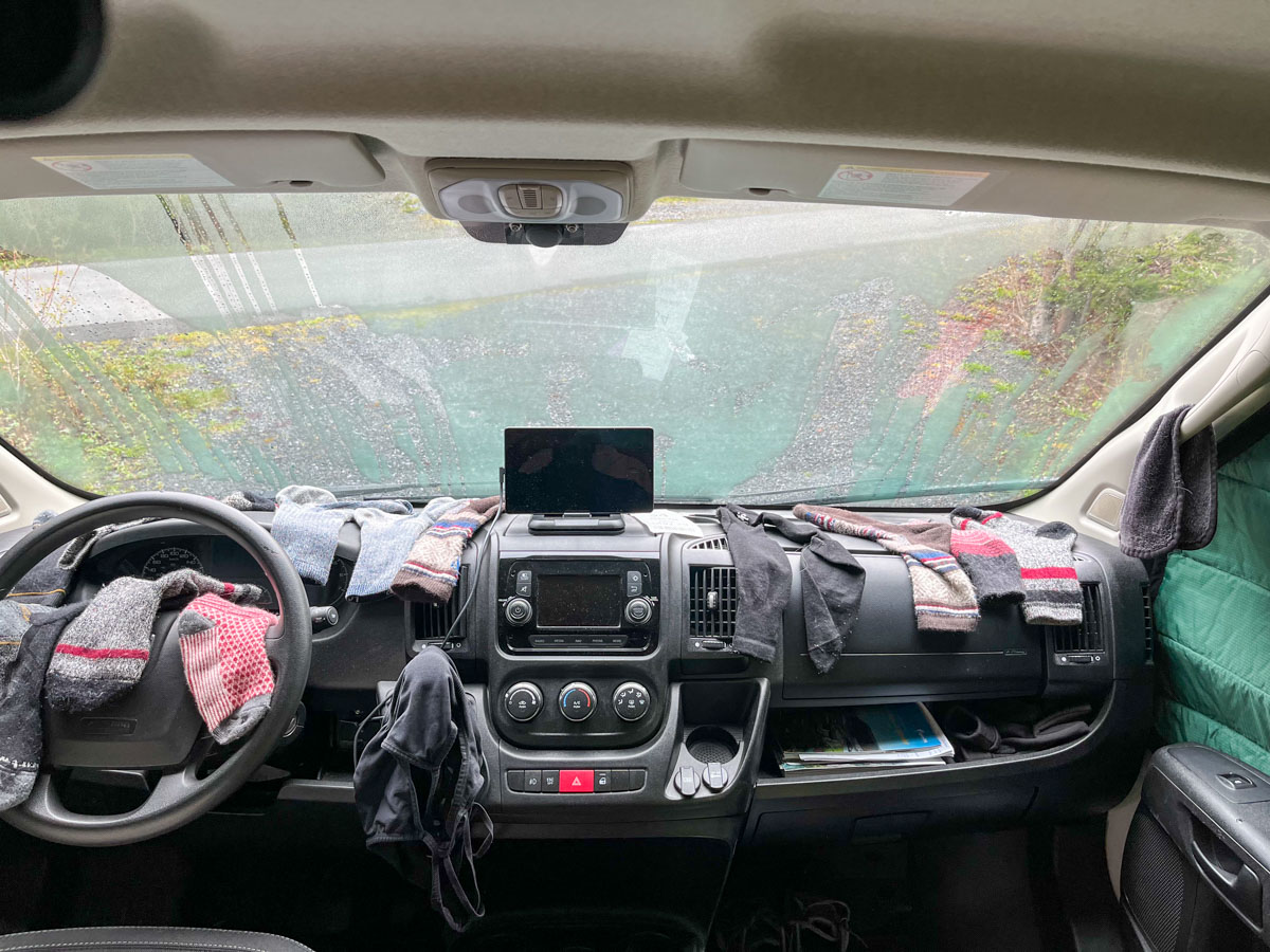 Dernier arrêt, le Parc National du Gros Morne, Berry Hill. C’est notre endroit pour 2 jours. Beaucoup de sentiers de marche débutent à cet endroit. On adore, pas besoin de rouler pour s’y rendre, on peut le faire à pied. C’est ce qu’on aime des parcs. Il pleut, donc, on fait quoi lorsqu’il pleut, du lavage. Ça fait près de deux semaines, il y en a pas mal. Mais il y a un problème, il pleut. On ne fait jamais le lavage quand il pleut. Mais finalement, on transforme la van en un énorme séchoir à linge. Tout ce qui ne va pas dans la sécheuse est partout. Ça me rappelle le temps que nous avions un voilier. C’est certain qu’on ne peut pas rouler avec ça.