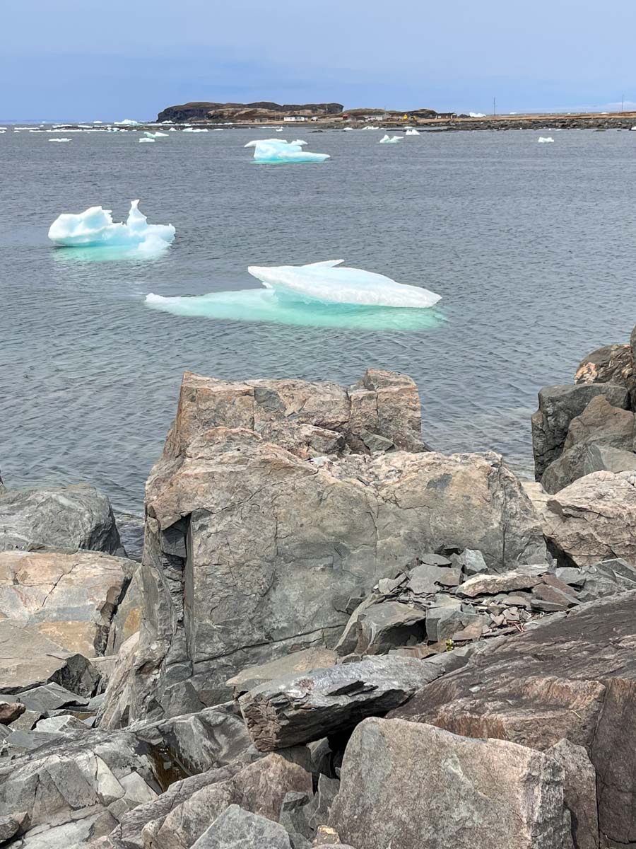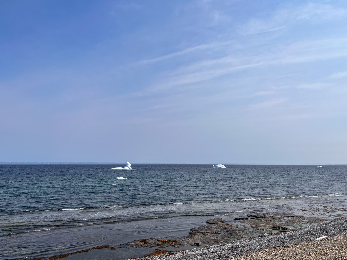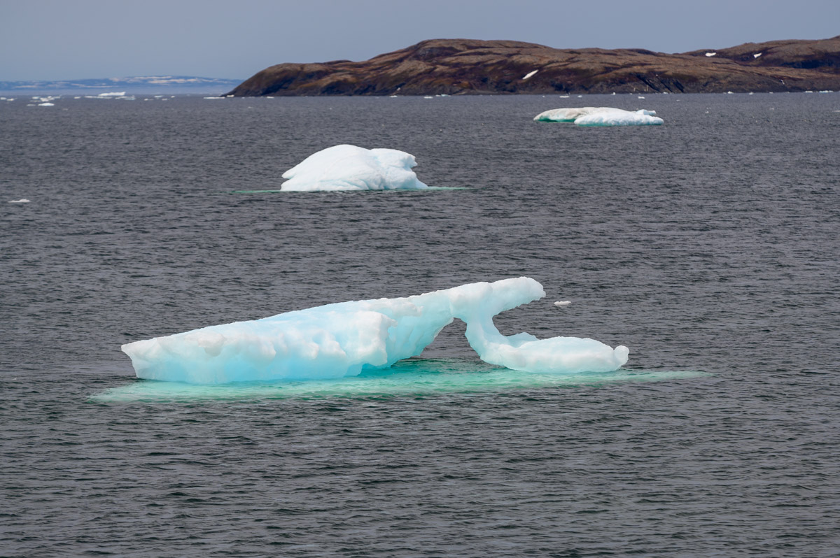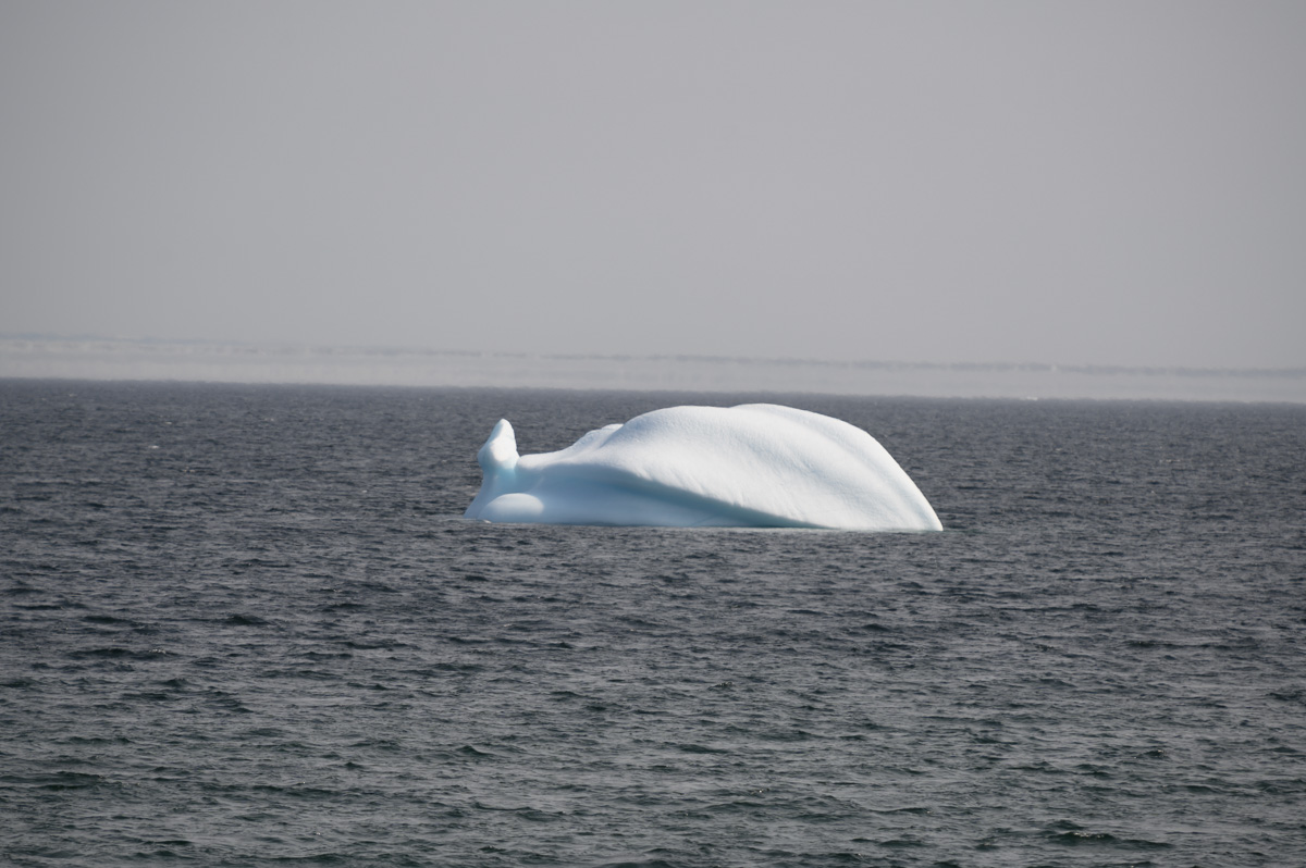 On roule, on roule, et tout près du détroit de Belle Isle, DES ICEBERGS. Le premier qu’on voit a la taille du traversier Labrador-Terre-Neuve. Ça donne une idée. On arrête, on prend des photos. On continue, encore d’autres, encore des photos. Le manège se poursuit un certain temps. Si vous venez à Terre-Neuve, tôt en saison, vous allez le vivre comme nous, c’est certain. Le premier est impressionnant. En prime, on voit le Labrador sur certaines photos.