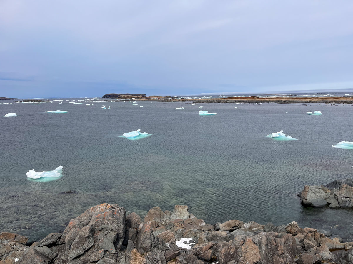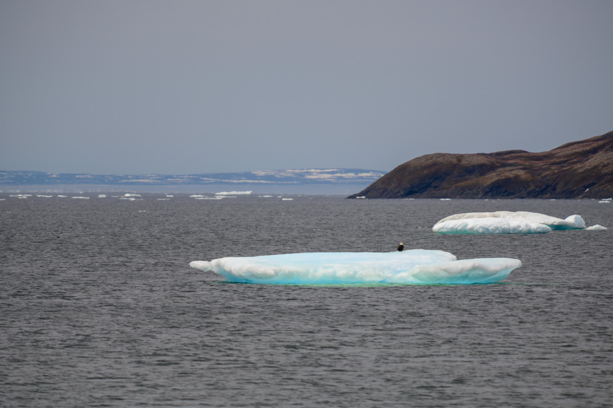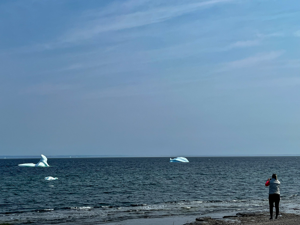 On roule, on roule, et tout près du détroit de Belle Isle, DES ICEBERGS. Le premier qu’on voit a la taille du traversier Labrador-Terre-Neuve. Ça donne une idée. On arrête, on prend des photos. On continue, encore d’autres, encore des photos. Le manège se poursuit un certain temps. Si vous venez à Terre-Neuve, tôt en saison, vous allez le vivre comme nous, c’est certain. Le premier est impressionnant. En prime, on voit le Labrador sur certaines photos.