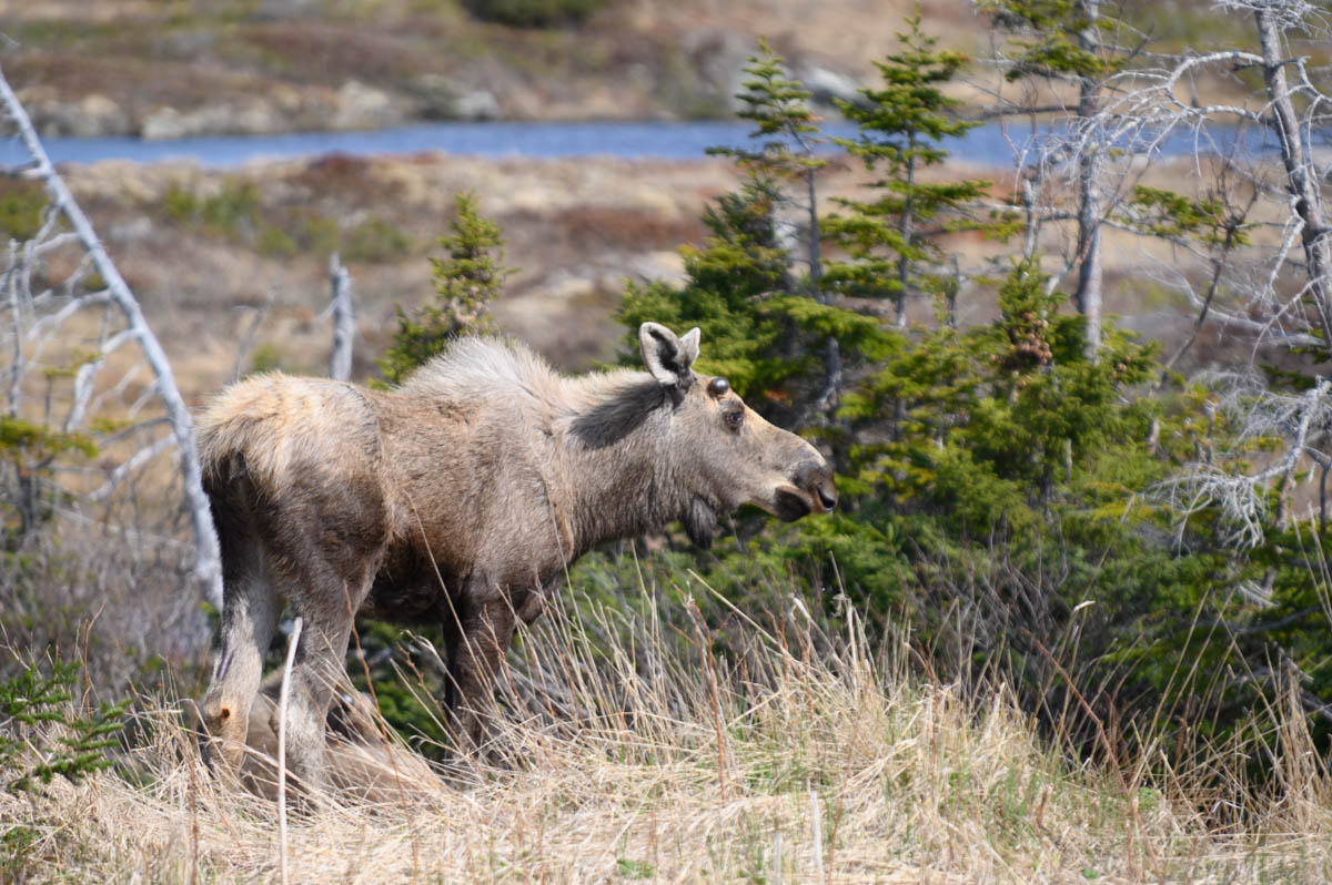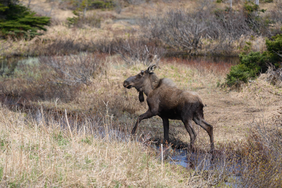Après s’être promené sur la grève, vu le phare, et s’être promis de ne plus revenir à Terre-Neuve aussi tôt en saison, on part pour le restaurant, en route, un beau renard argenté, et un orignal.