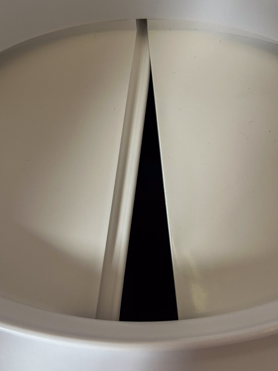 - La petite pente embossée, dans la partie solide, qui permet de ne pas envoyer de liquide dans la partie solide, il est ainsi redirigé dans la partie liquide
